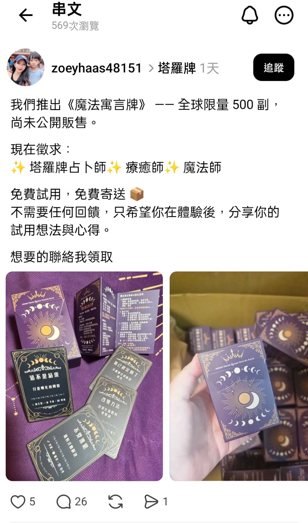 近日,靈性與占卜品牌「月相女王」主動揭露,有不明帳號未經授權,挪用其過往公開內容與語感,包裝成塔羅牌試用與魔法商品招募,疑似藉由靈性話術引導私下聯絡,引發外界關注。