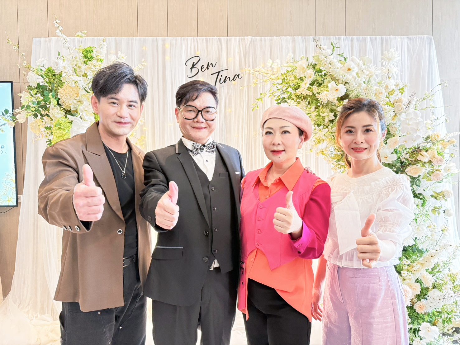 圖說:七郎嫁女兒豪記唱片同門歌手吳俊宏(左起) 、七郎、張秀卿、林姍齊聚祝賀。(豪記唱片提供)