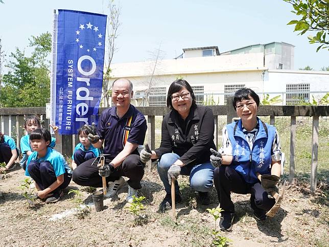 2.(右起)雲林縣政府教育處督學陳麗宇、縣議員黃美瑤、歐德傢俱總經理陳國甫,一同與孩子開心植樹,為下一代打造更友善的生活環境。