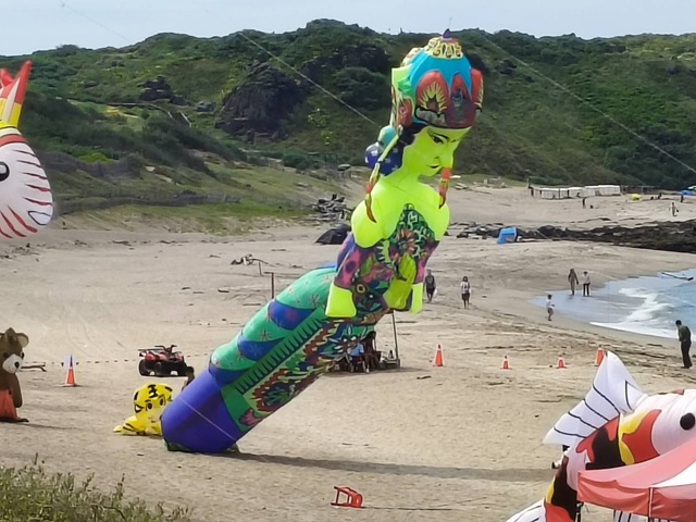 另外還有首次在白沙灣亮相的「獅子魚」與「海螺」大型風箏,都是國內選手帶來非常鮮豔可愛的風箏。本次也有許多外國風箏團隊帶來特別的風箏,像泰國帶來忍者龜潛水員,印尼帶來神話故事裡美麗的Dewi Sinta,本次印尼的風箏選手中還有風箏第三代年齡分別為8歲、9歲及12歲的選手,非常厲害,韓國選手也不惶多讓,帶來了可愛的Pucca及8米長的江南大叔,德國則帶來即將到來的萬聖節南瓜,瑞士則帶來許多愛心風箏,今天天氣非常的晴朗,讓北海岸天空佈滿風箏。