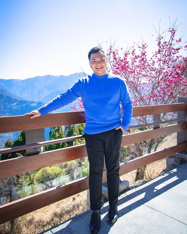 ▲創辦人蘇炘睿於合歡山區拍攝,背後是台灣山巒與櫻花,這張照片象徵蘇炘睿「以人為本、走進土地」的信念,呼應蘇炘睿返鄉推動觀光轉型的初心