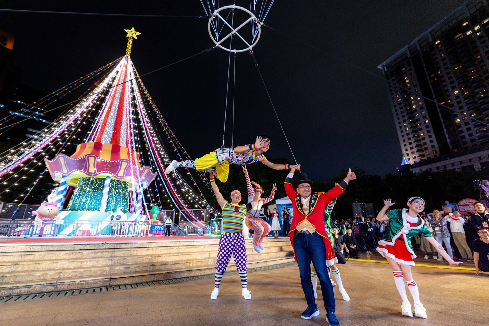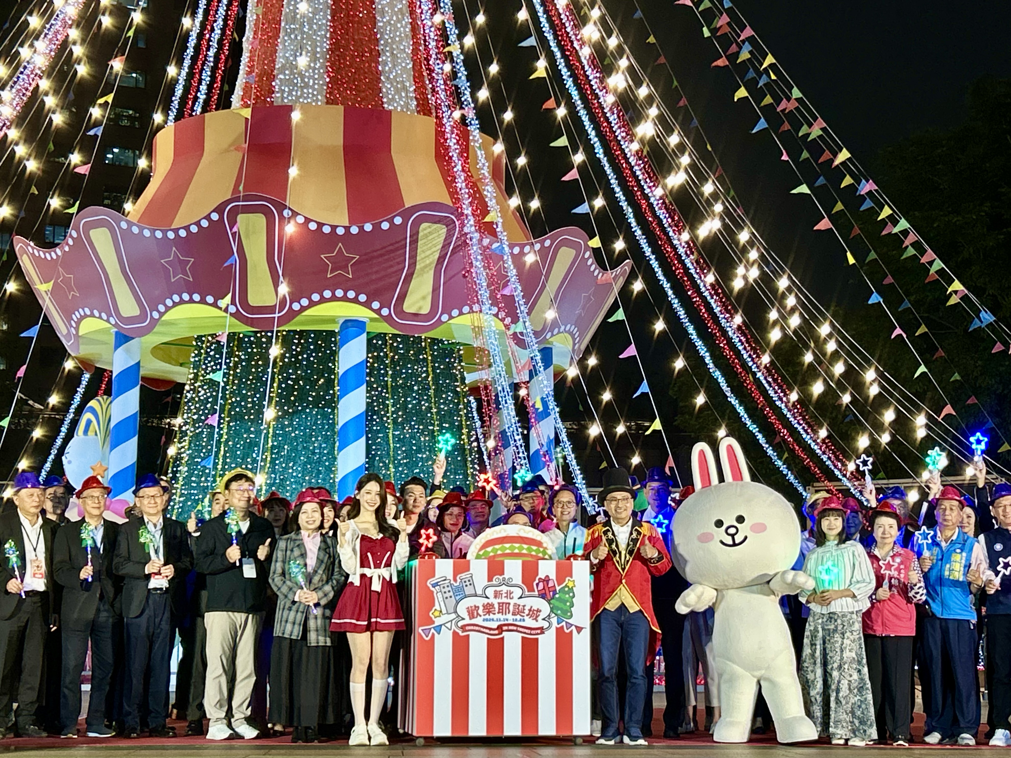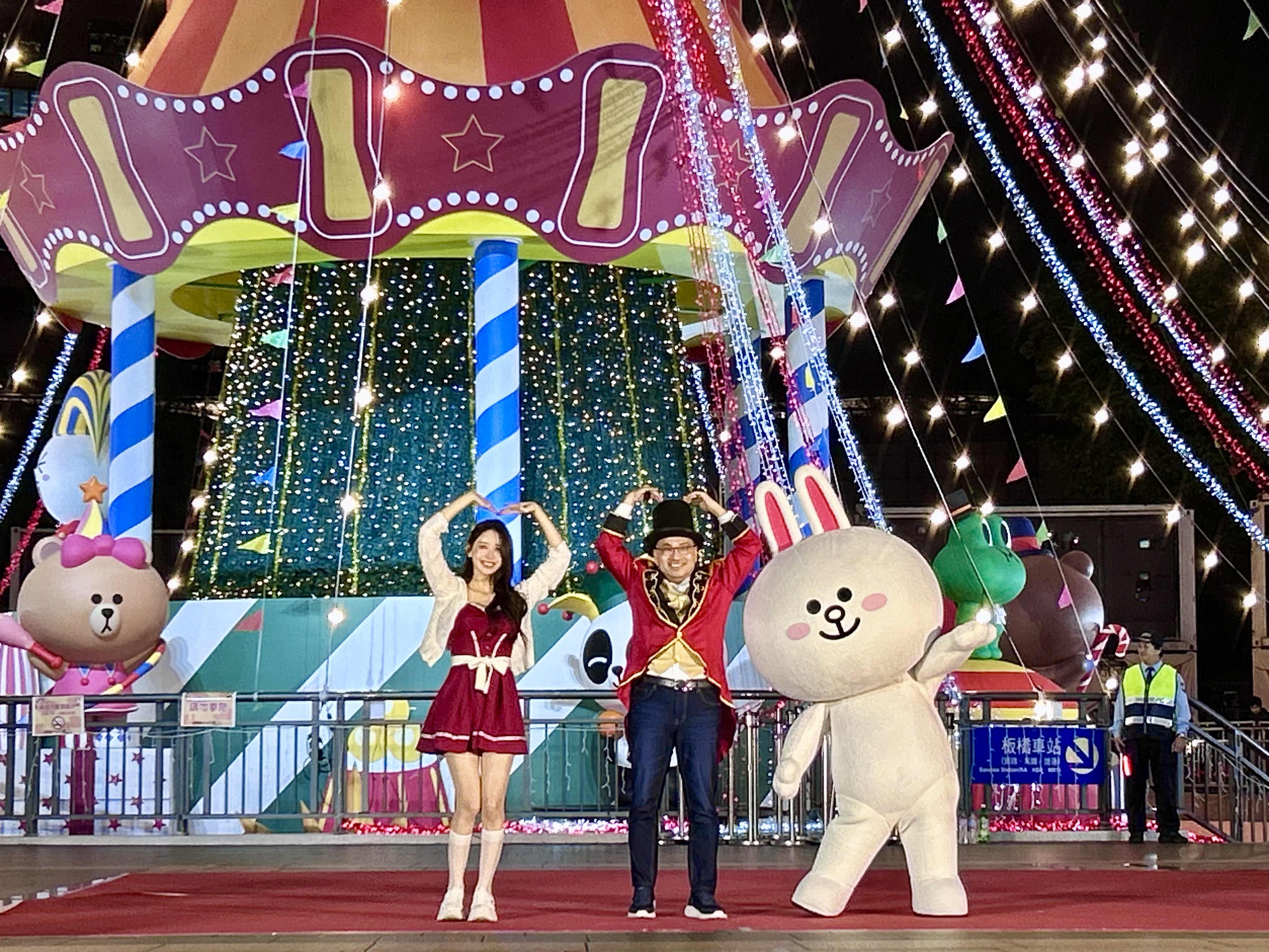 【林文強/新北市訊】「2025新北歡樂耶誕城」今(14)日晚間以震撼開場的「耶誕馬戲開城SHOW」華麗登場!今年攜手全球人氣IP「LINE FRIENDS & LINE FRIENDS minini」,以童趣風格打造全城燈飾與主題場景,耶誕樹「歡樂馬戲棚」亮起瞬間,全場尖叫聲此起彼落,掀起冬季最歡樂的序幕。