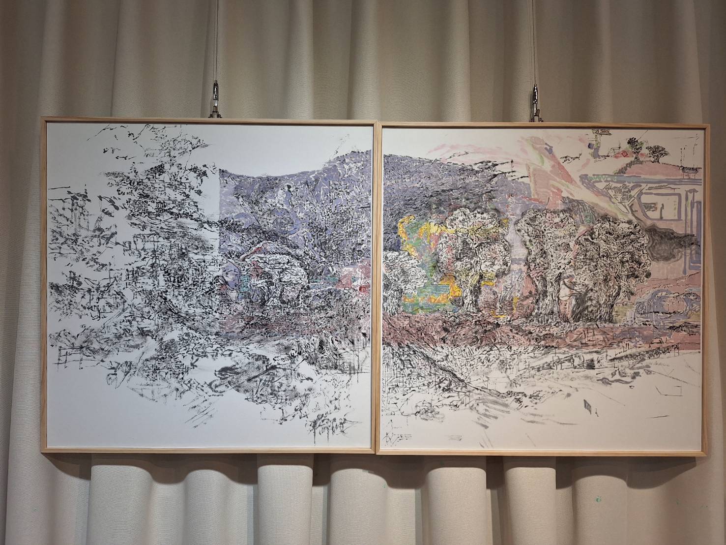 吳軒慧特別強調,其中3組雙聯幅畫為主軸。創作靈感來自於2024年參與蘭陽媽祖海巡與陸巡遼境經驗·這段身體性的行動,延續了在法國的研究:「行走」與「書寫」的脈络,筆跡在紙上流動,線條以不同節奏穿越紙面,如同身體在地景中的行進。