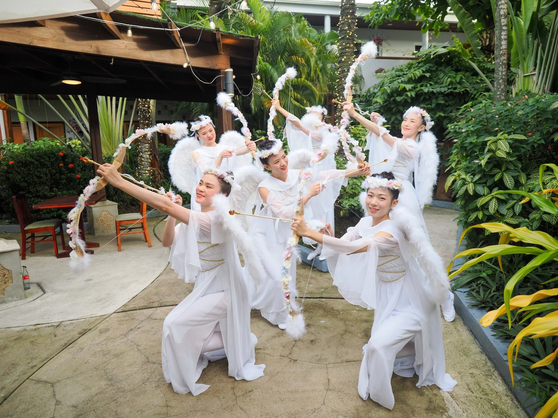 有別於過往的展演,此次天使展演特別融入了「天使弓箭」;弓箭的箭鏃以心型呈現,象徵將愛與和平的種子用心精準而深遠地傳遞出去。在巴哈馬演出前的彩排,當展演的天使們面向晴空揮動羽翼時,那份純淨的能量再次洗滌了她的心。