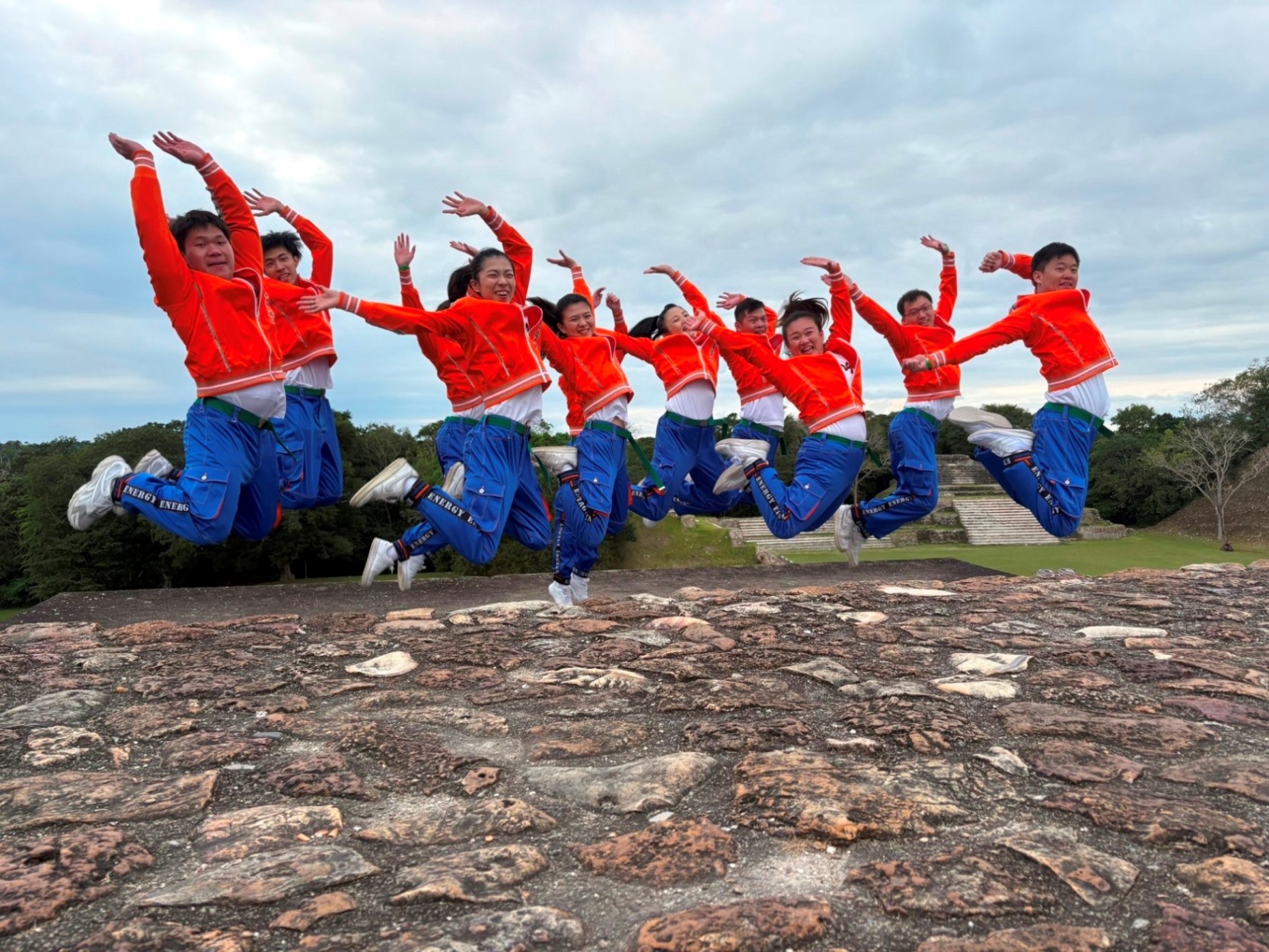 圖說P2:在貝里斯瑪雅金字塔前,欣平(左三)與志工們一躍而起,把快樂分享給彼此,向世界傳遞純粹的喜悅。