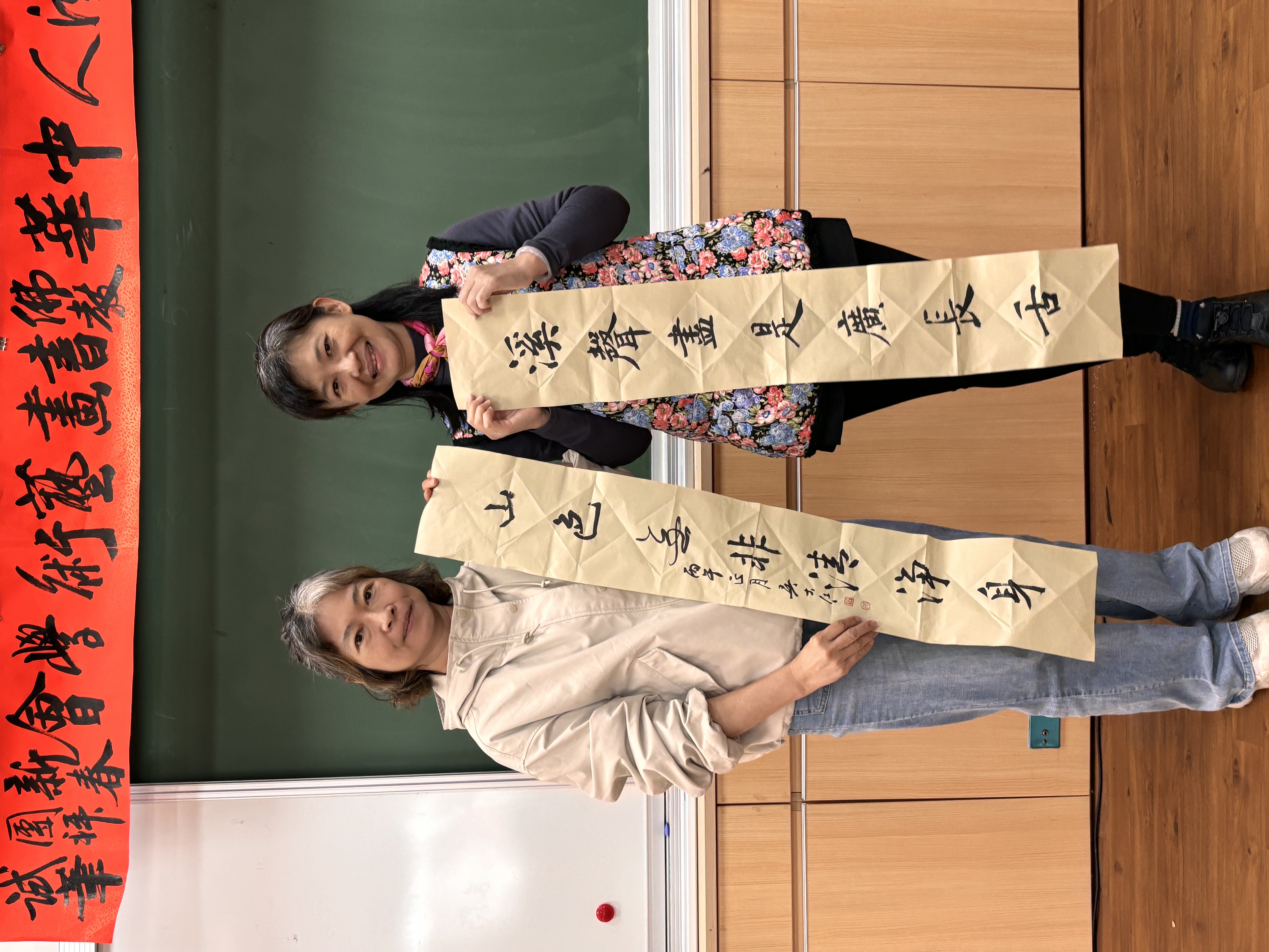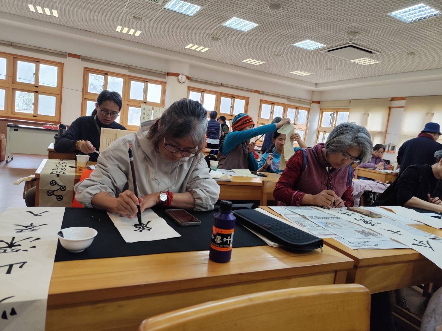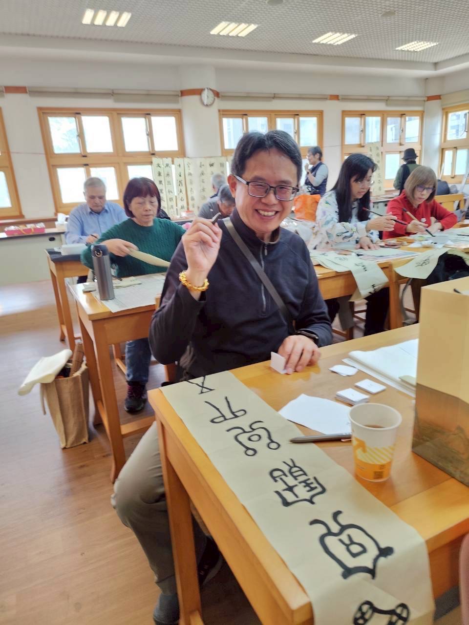 之後,即舉行新春團拜活動。參舉者互道恭喜,希望在馬年都能吉祥如意,心想事成。然後進行新春試筆。吳軒慧及吳大仁、黃智鳳伉儷帶領大家試筆,大家分別在宣紙上,以學會提供的筆、墨寫上對聯。