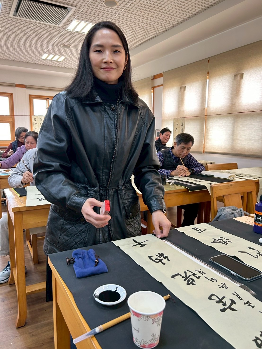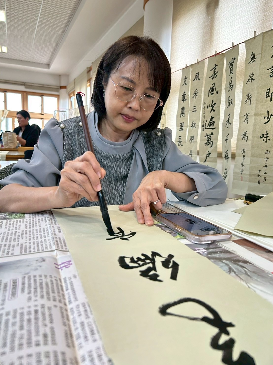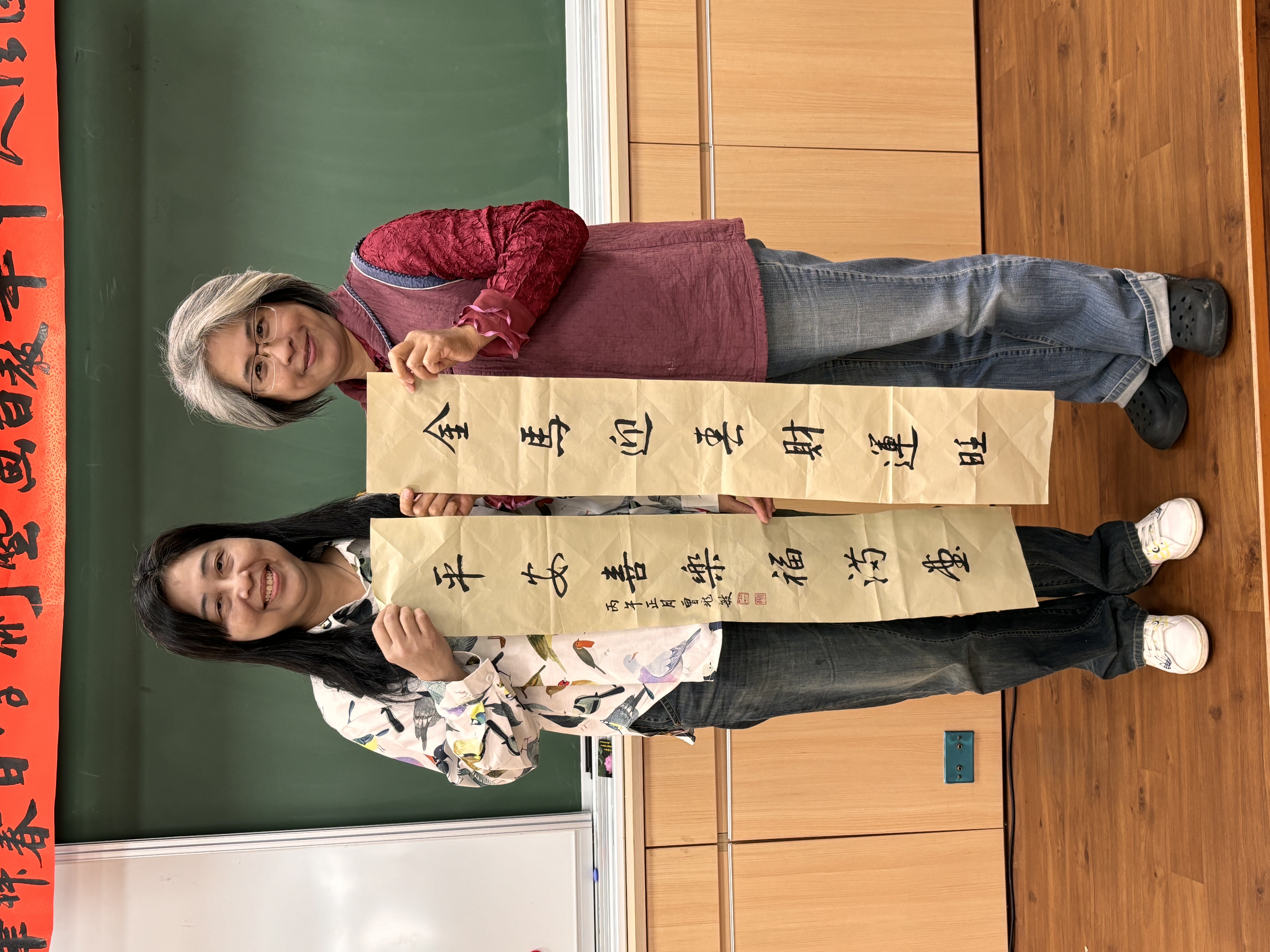 之後,即舉行新春團拜活動。參舉者互道恭喜,希望在馬年都能吉祥如意,心想事成。然後進行新春試筆。吳軒慧及吳大仁、黃智鳳伉儷帶領大家試筆,大家分別在宣紙上,以學會提供的筆、墨寫上對聯。