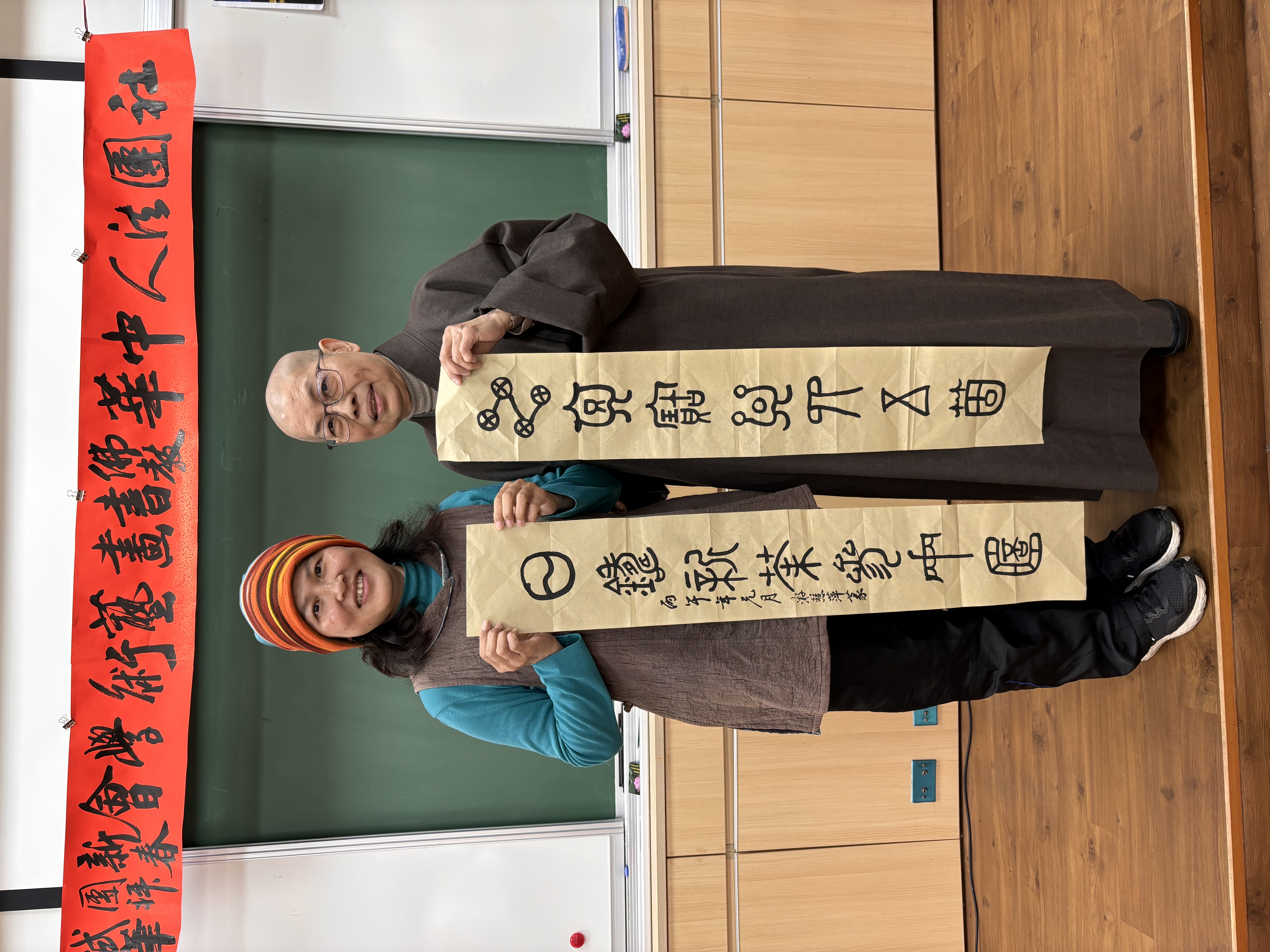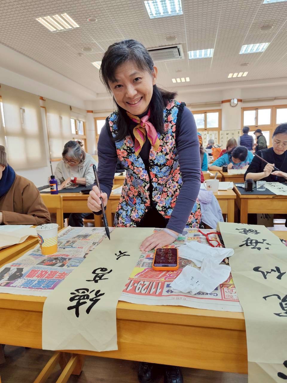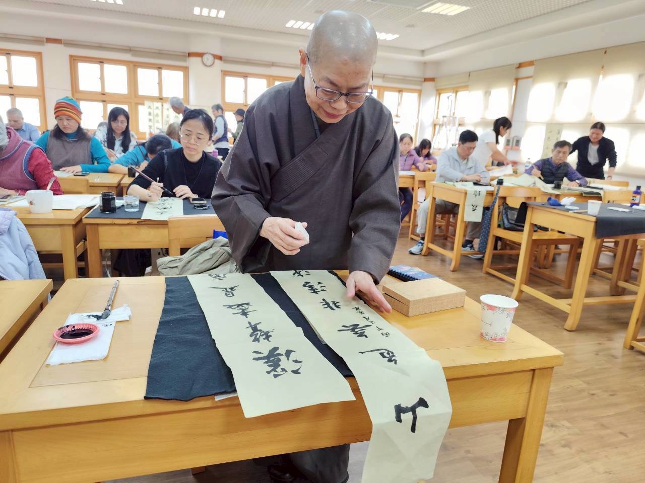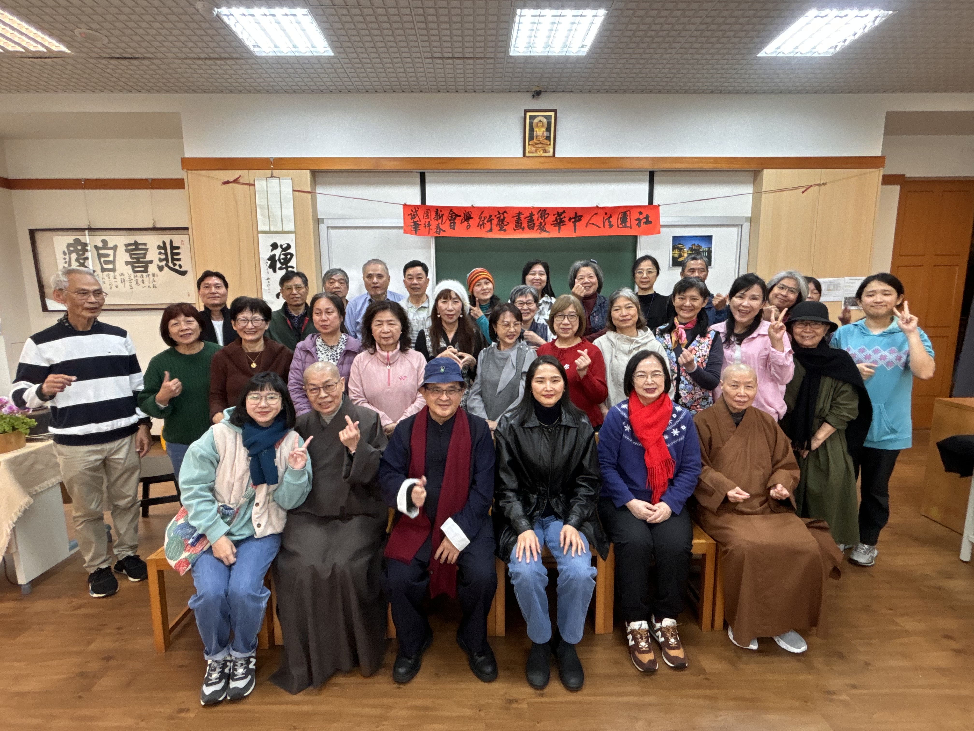 社團法人中華佛教書畫藝術學會昨〈7)日在桃園市中壢區某寺院舉行新春團拜試筆活動,由理事長暨華梵大學佛藝系助理教授吳軒慧博士主持,前任理事長、兩岸知名書法篆刻大師、華梵大學佛藝系助理教授吳大仁、黃智鳳伉儷到場指導。場面相當熱鬧。