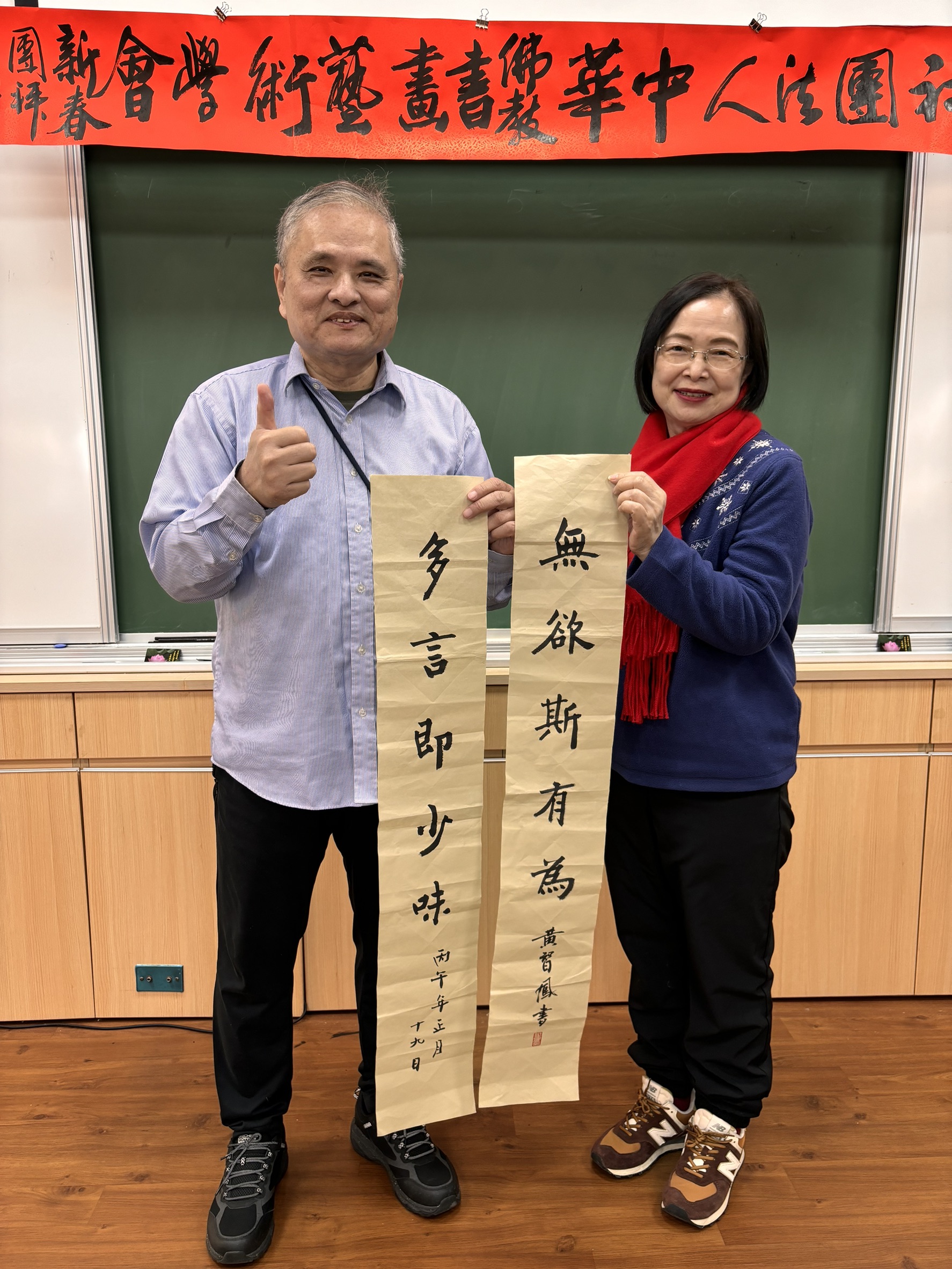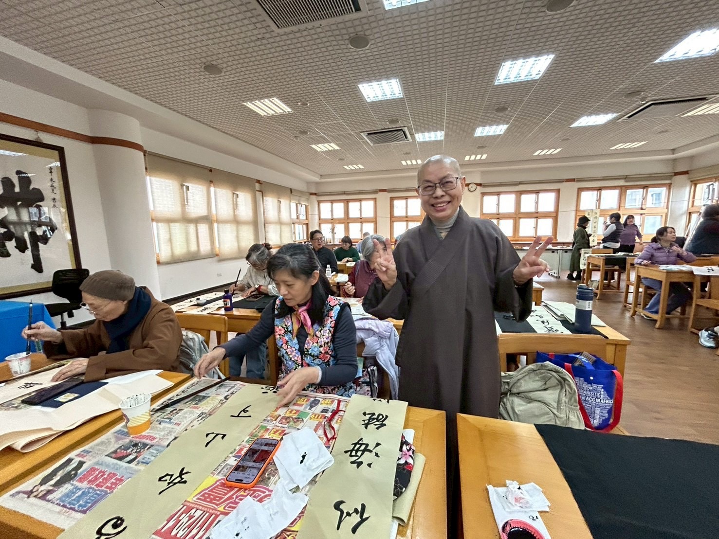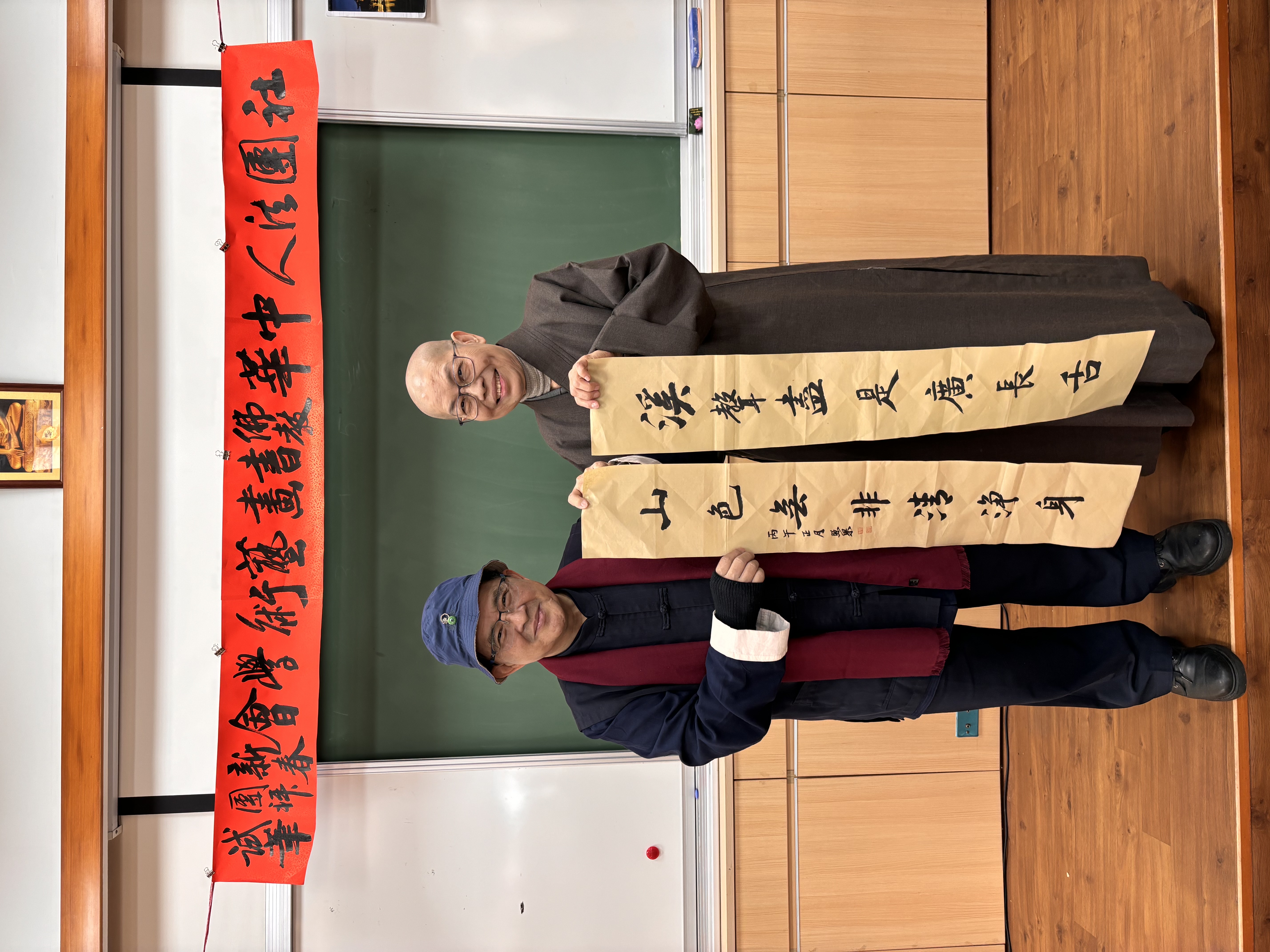 社團法人中華佛教書畫藝術學會昨〈7)日在桃園市中壢區某寺院舉行新春團拜試筆活動,由理事長暨華梵大學佛藝系助理教授吳軒慧博士主持,前任理事長、兩岸知名書法篆刻大師、華梵大學佛藝系助理教授吳大仁、黃智鳳伉儷到場指導。場面相當熱鬧。