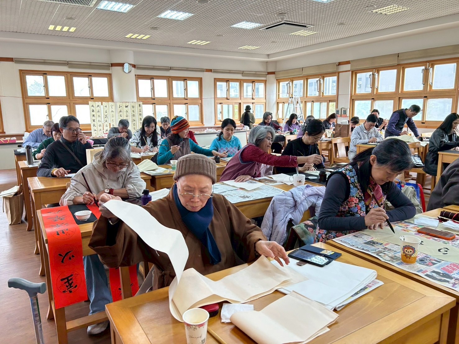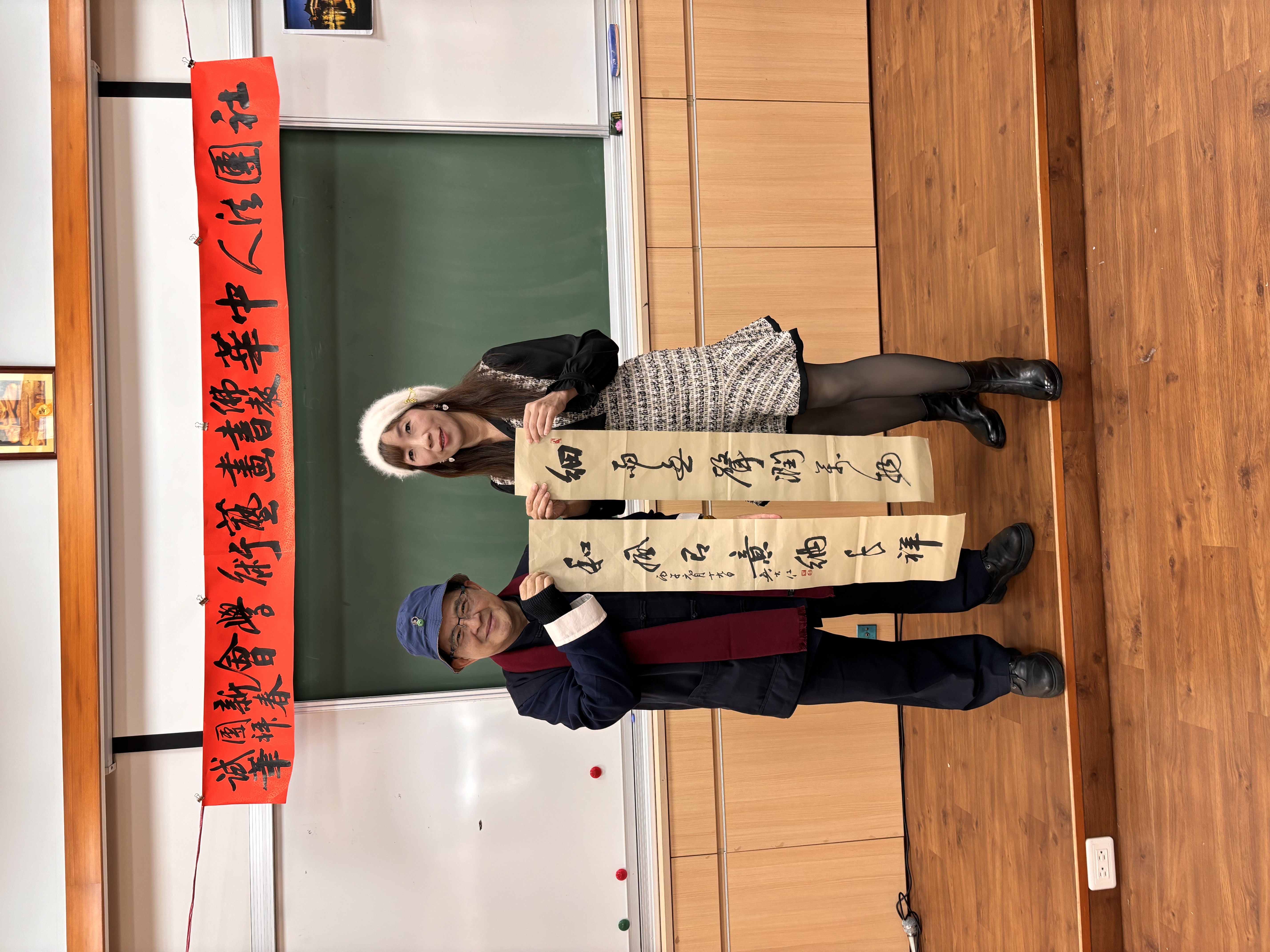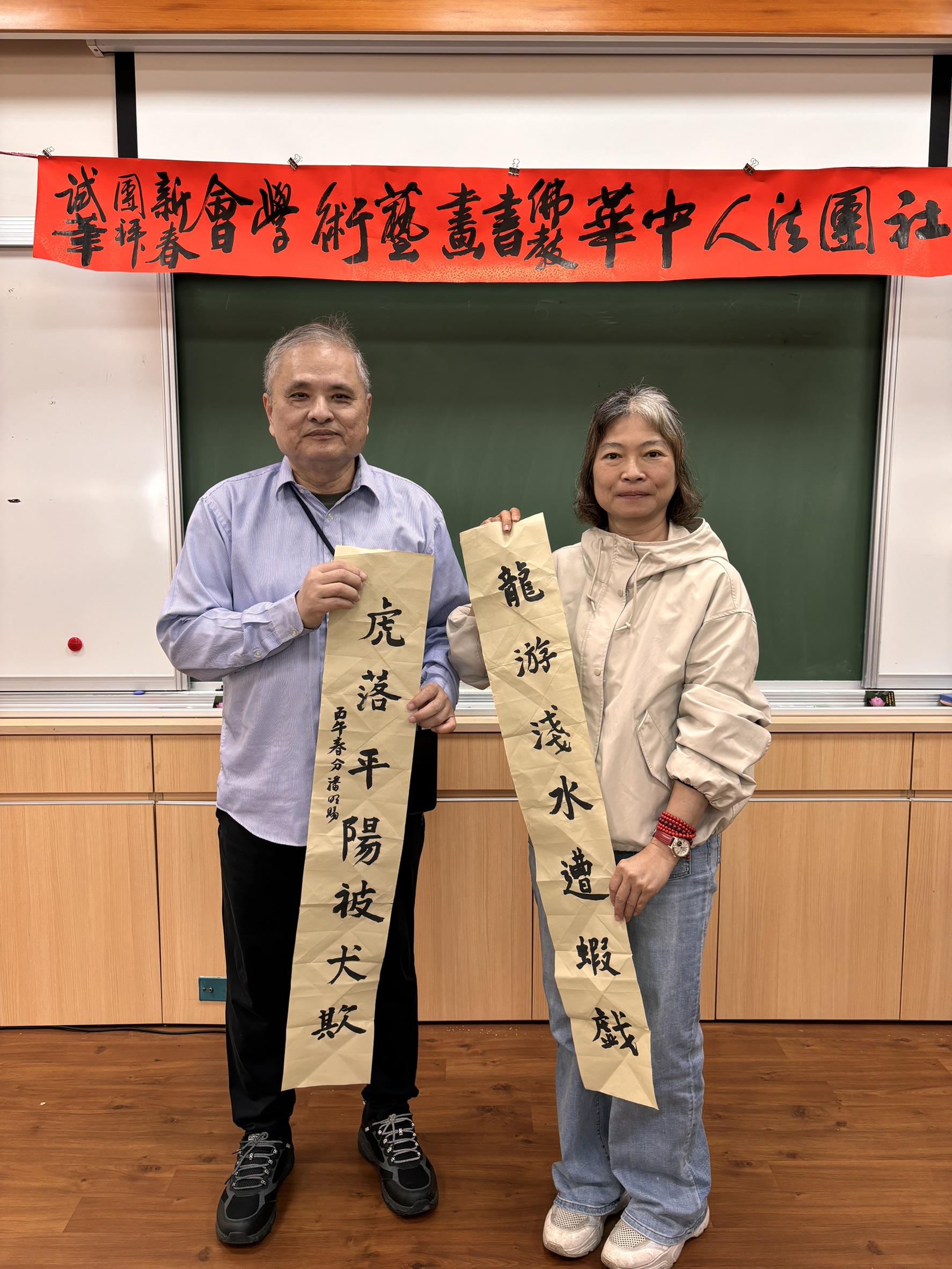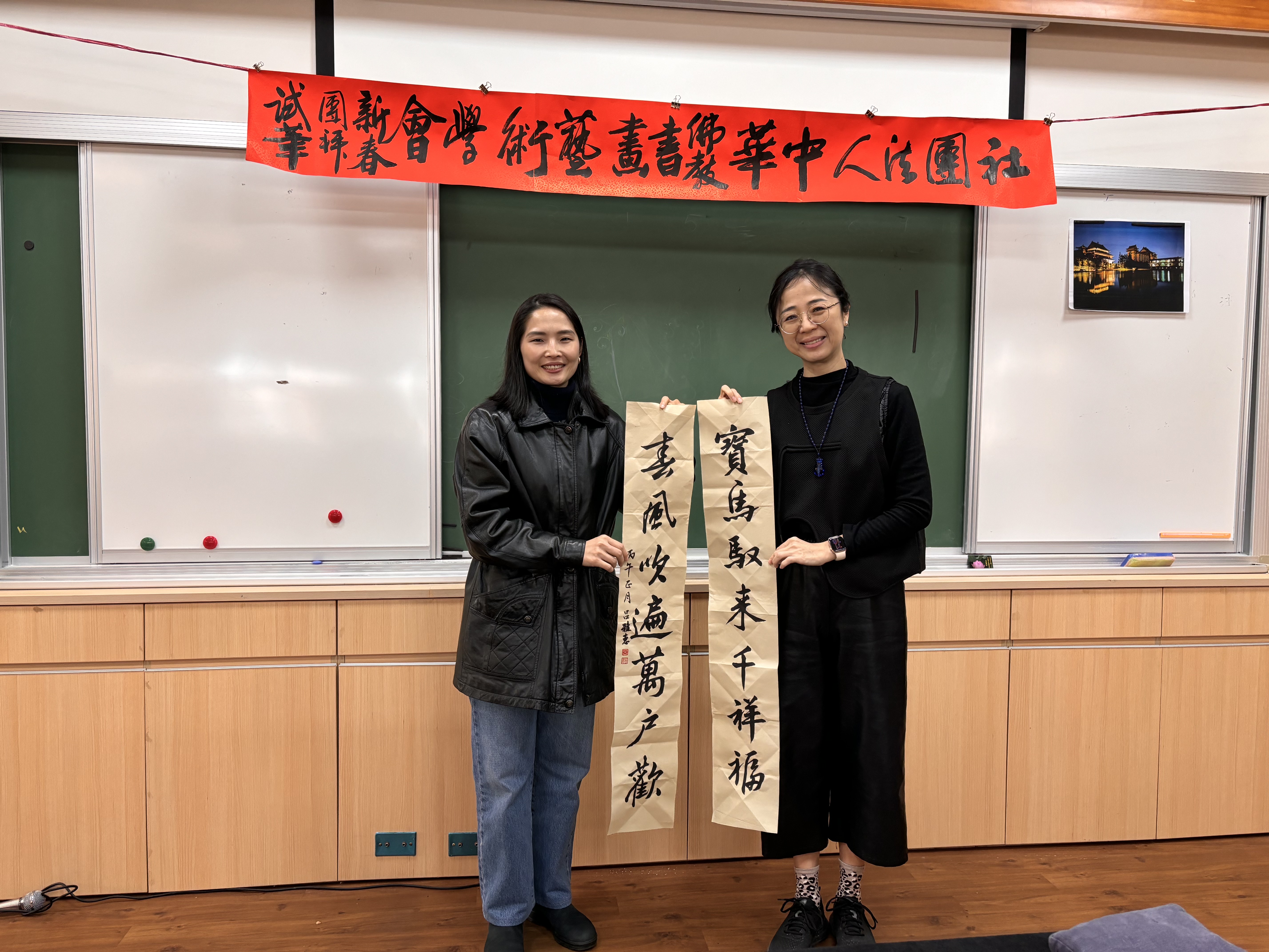社團法人中華佛教書畫藝術學會昨〈7)日在桃園市中壢區某寺院舉行新春團拜試筆活動,由理事長暨華梵大學佛藝系助理教授吳軒慧博士主持,前任理事長、兩岸知名書法篆刻大師、華梵大學佛藝系助理教授吳大仁、黃智鳳伉儷到場指導。場面相當熱鬧。