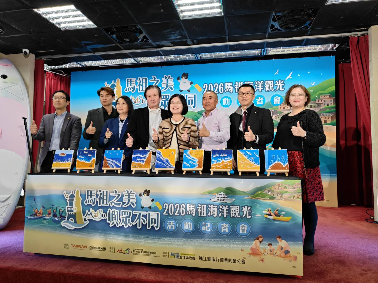 馬管處於今(3月11日)在交通部觀光署旅遊服務中心舉辦「2026馬祖海洋觀光活動」系列活動宣傳記者會,正式揭開年度觀光亮點序幕。今年活動以「海上看莒光」、「海上看東引」、「親子海上觀光遊憩」及「馬鼻灣假日市集音樂會」等多元形式展開,結合海上視角與島嶼文化,邀請旅人以嶄新的方式重新認識馬祖。記者會現場邀集交通部觀光署黃荷婷副署長、景區發展組黃怡平組長、連江縣政府交通旅遊局陳如嵐局長、連江縣旅行商業同業公會楊曜誌理事長、采盟股份有限公司林啓聖經理、華信航空莊明哲總經理、立榮航空高德燕協理、長汎旅行社吳建興協理、台灣國際觀光產業發展協會林玉華理事長、台灣旅行業國民旅遊發展協會陳士廷監事及交通部觀光署馬祖國家風景區管處洪志光處長等貴賓共同出席製作海廢藝術,也宣告年度系列活動正式啟動。