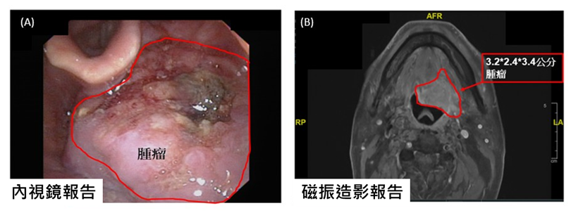 SBRT 治療前影像顯示,舌根下方可見約 3.2 × 2.4 × 3.4 公分腫瘤病灶,為本次治療主要標的 圖/亞東醫院提供