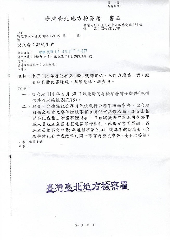 在所有証據齊全下;無論行政院、台北市府、廉政署等政風單位多次去函,甚至最高檢、高檢也多次函請地檢依法處理,但他們就是裝瞎、裝死,且把我「告訴人」身份改為「告發人」,及「偵字案」改為「他字案」後,即不再開庭,對我提出的偽造文書做案証據,均不做偵辦動作,反而誣衊本人全無証據,僅憑臆測,更以不具名方式以「例稿」搪塞,非常不負責任。