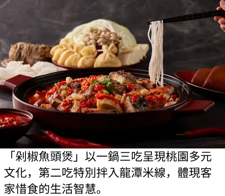吃法上,也以「一鍋三吃」展現風味轉折。第一吃,帶有眷村飲食脈絡的剁椒魚頭乾鍋,加入大溪豆干後,不但更增添紮實口感,香辣濃郁風味也如桃園人般深厚情義;第二吃,將作為客家代表的龍潭米線拌入鍋中,米線吸滿醬汁後,不但辣度轉為柔和,風味更顯細膩,體現客家惜食的生活智慧;第三吃,則加入高湯轉化為暖鍋,邀賓客圍桌共享,湯頭融合魚香與椒香,整體風味從濃烈走向圓融,入口溫潤順口、尾韻回甘,正象徵桃園在時間積累下匯聚共融,展現出精華薈萃的嶄新面貌。