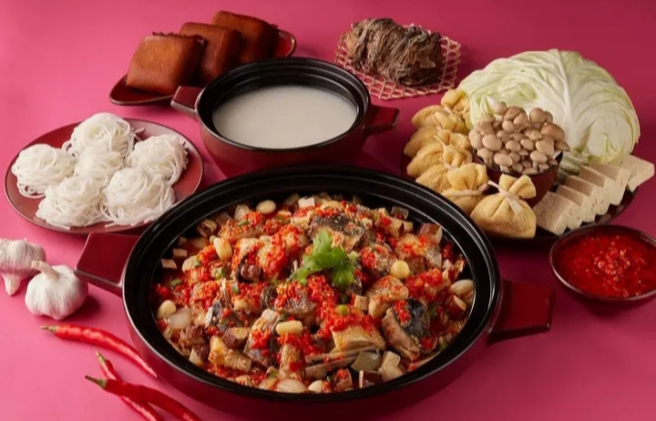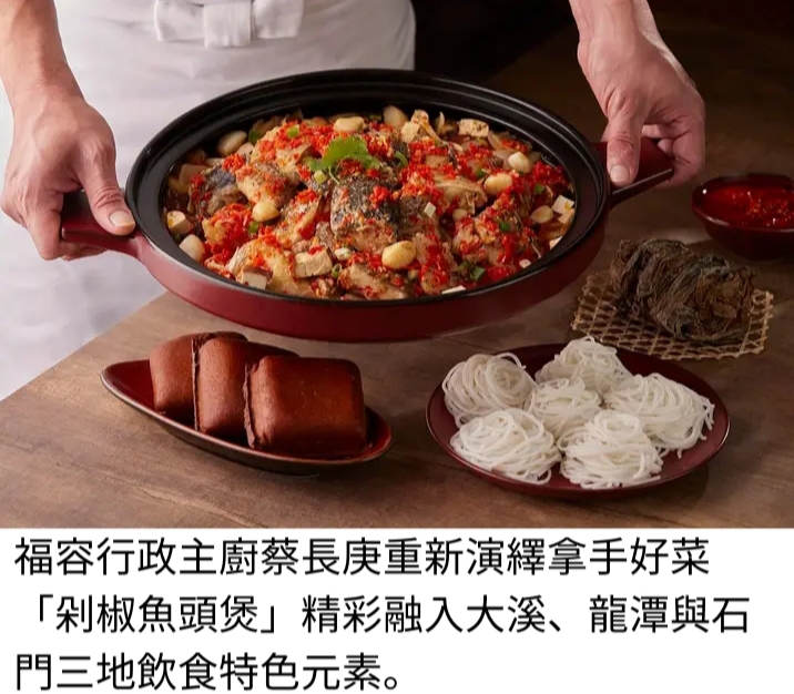 主打料理「剁椒魚頭煲」,為福容大飯店行政主廚蔡長庚經典拿手名菜,此次結合桃園大溪、龍潭與石門三地特色進行創新演繹。料理發想自石門水庫鮮魚料理的鮮美意象,搭配以濃厚豆香與滷製後的鹹香回甘著名的大溪豆干。另外,細緻滑順、富彈性的龍潭米線,堆疊出層次豐富的桃園風味,讓一道料理同時呈現山、水、人文交織的在地特色。