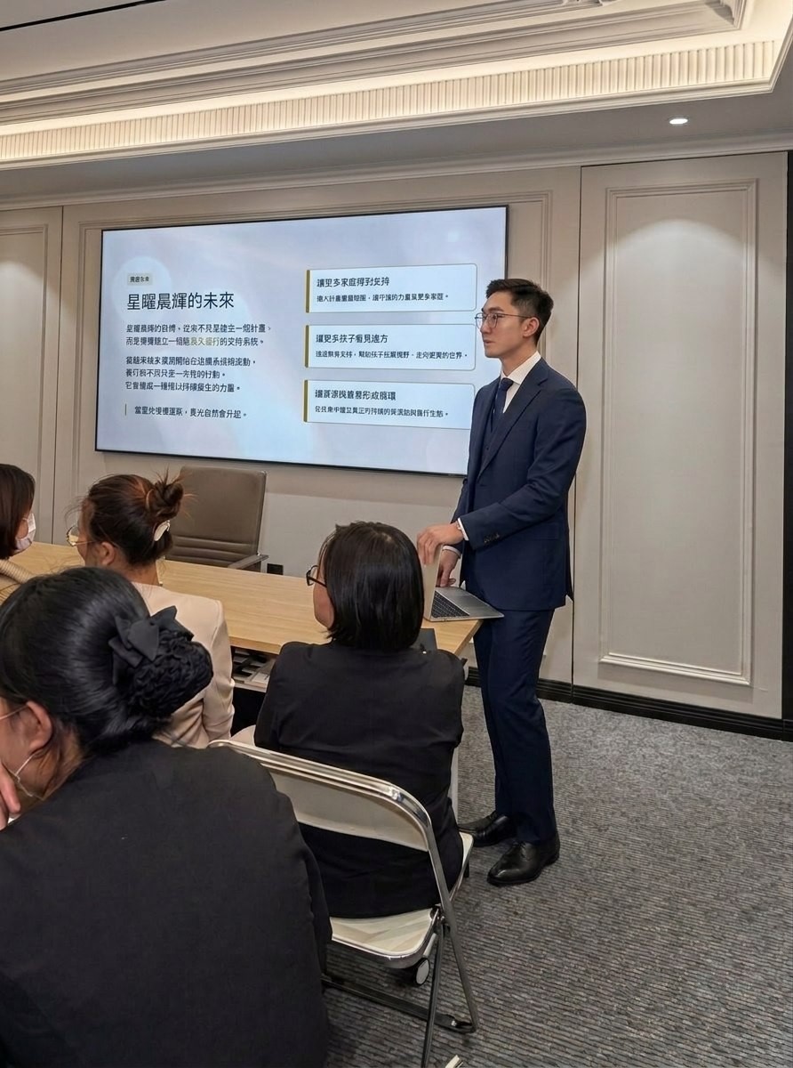 ▲尤曜銘於現場簡報「星曜晨輝」架構,說明資源運作與長期支持模式