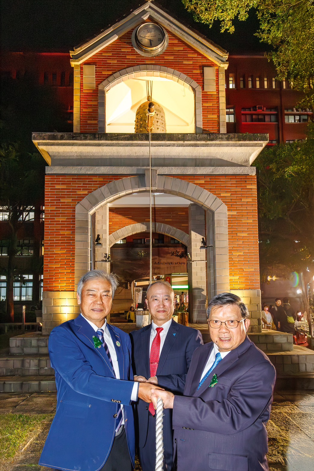 ▲圖/陳慶和校長、粘舜權理事長與葉寅夫董事長一同敲響象徵祝福與希望的和平鐘!(圖/億光文化基金會提供)