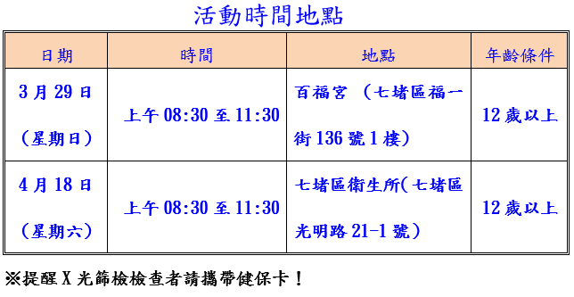 基隆市七堵衛生所為了您的健康,針對慢性疾病民眾,於115年3月29日及4月18日辦理兩場X光巡檢活動,希望藉此引起大眾對結核病的關注,進而攜手終結結核病。如果檢查後發現肺結節或疑似肺結核感染,應儘快至胸腔內科門診進一步追蹤檢查。