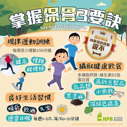 每週可安排3至5次適度運動,例如快走、爬樓梯、伸展運動或肌力訓練等,不僅有助於維持骨質密度,也能增進肌肉力量與身體平衡能力,降低跌倒及骨折的風險。