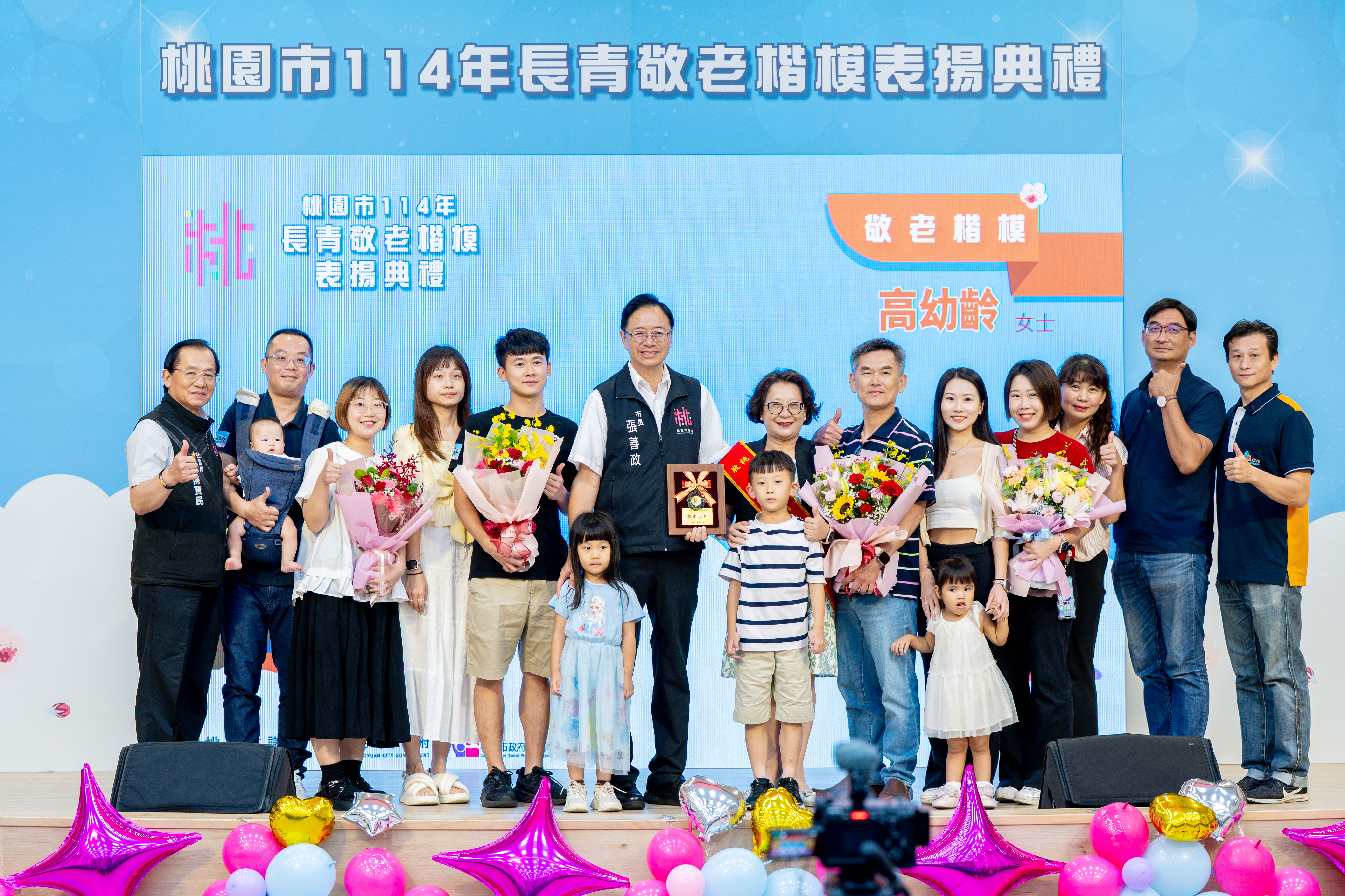 桃園市長張善政今(18)日下午於市府B2大禮堂出席「桃園市114年長青敬老楷模表揚活動」。張市長表示,重陽節即將到來,市府特別藉此機會向長者致上最誠摯的敬意,今(114)年共有20位長青楷模、20位敬老楷模及2家敬老企業接受表揚,其中最年長者高齡98歲,很高興看到許多長者親自出席領獎,展現健康長壽、精神奕奕的風采。