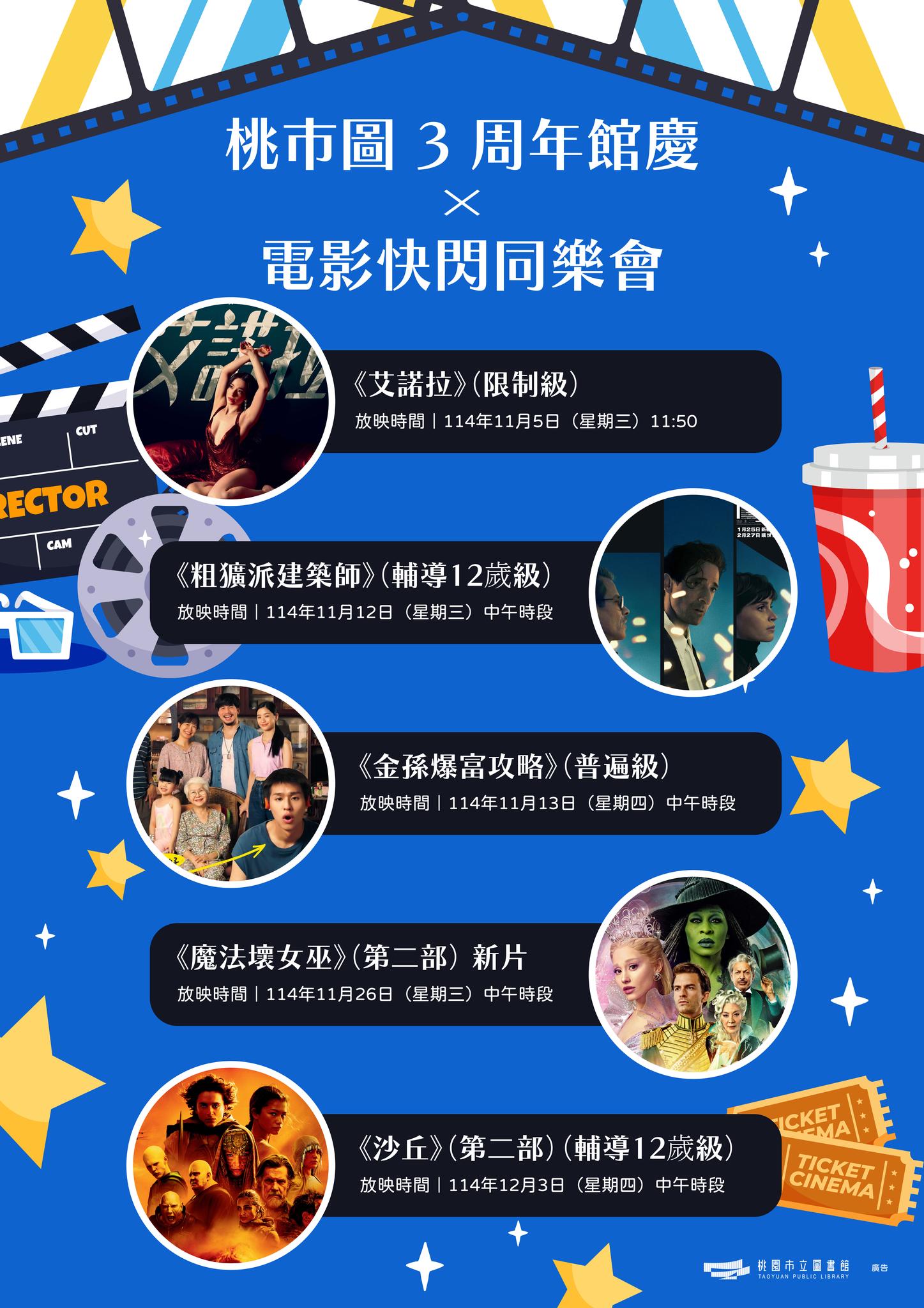 桃園市立圖書館主辦的「2025桃園閱讀節」以主題「BookIN Taoyuan 閱讀一家E」為主軸,結合科技與閱讀,打造跨界體驗活動。今年特別攜手「桃知道威秀影城」推出公益電影系列——「電影快閃同樂會」,邀請市民以影像閱讀世界,在光影中感受知識與想像的力量。
