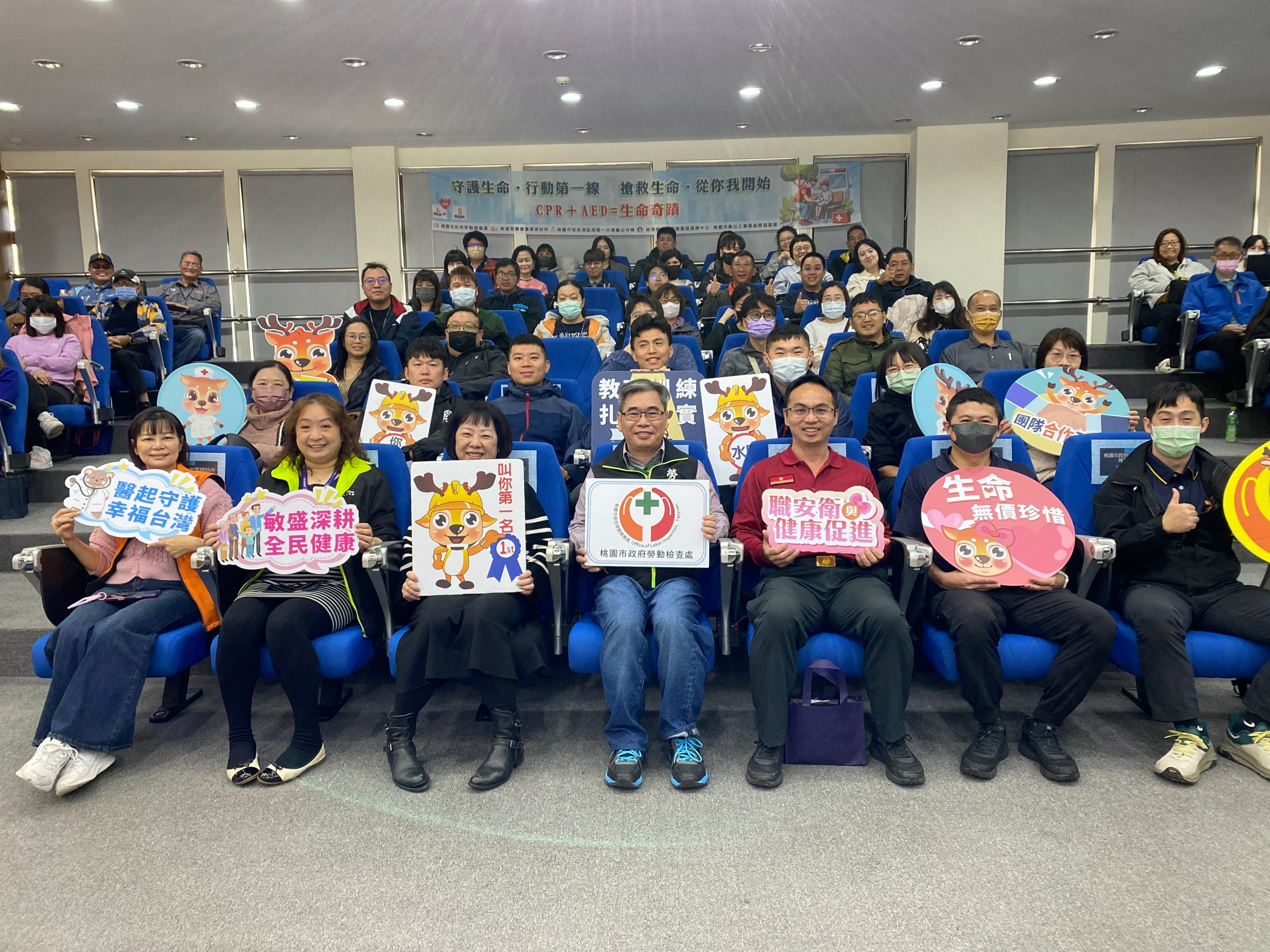 為全面提升桃園市各事業單位的職業安全衛生水準,落實「安全上班、平安回家」的核心理念,桃園市政府勞動檢查處今(12/4)日透過公私協力,與敏盛智慧健康管理診所、桃園市政府消防局第一大隊龜山分隊、經濟部龜山產業園區服務中心及桃園市龜山工業區廠商協進會合作,辦理百人CPR+AED急救技能宣導與實作訓練課程,旨在強化職場第一線相關人員(如急救人員、職業安全衛生人員、從事勞工健康服務護理人員及職場健康管理人等)緊急處置能力,以有效降低事故風險並提升整體職場安全能量。
