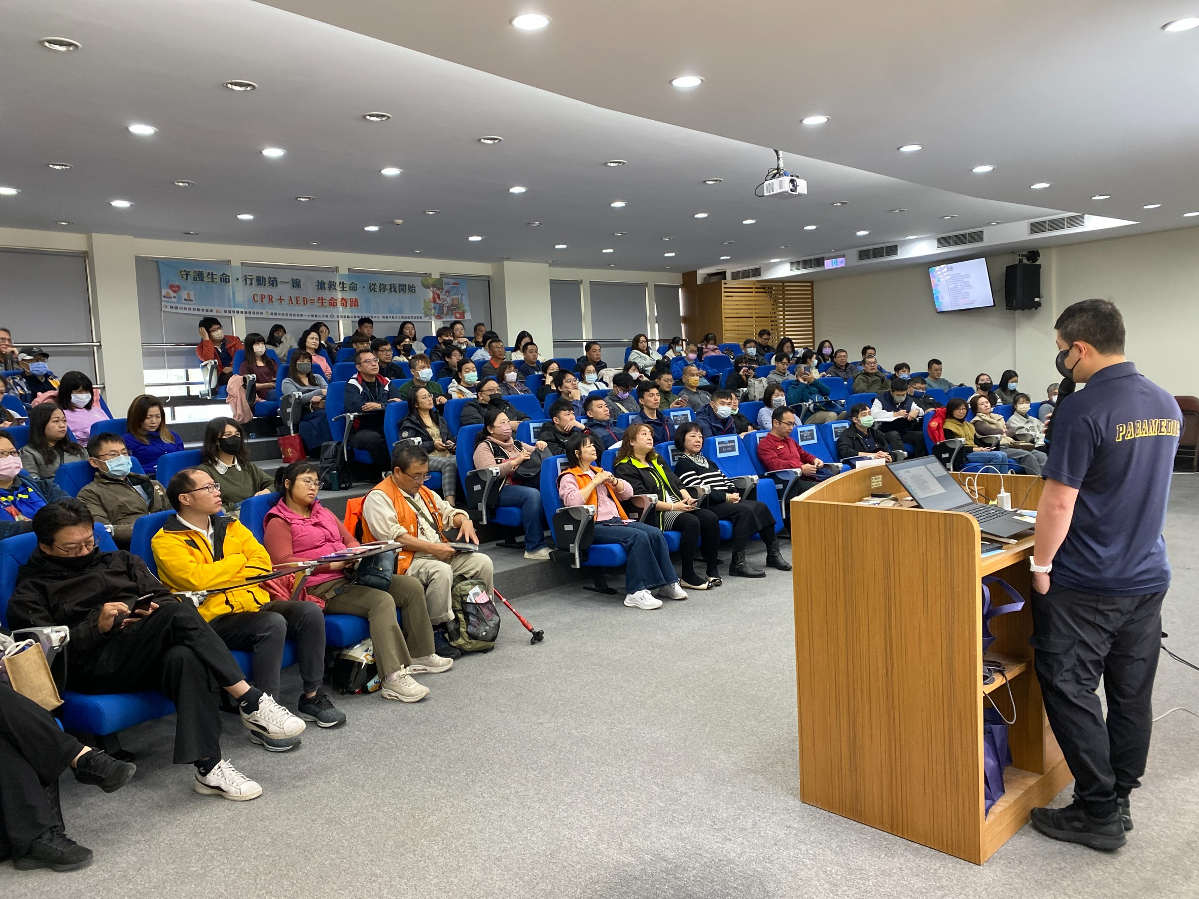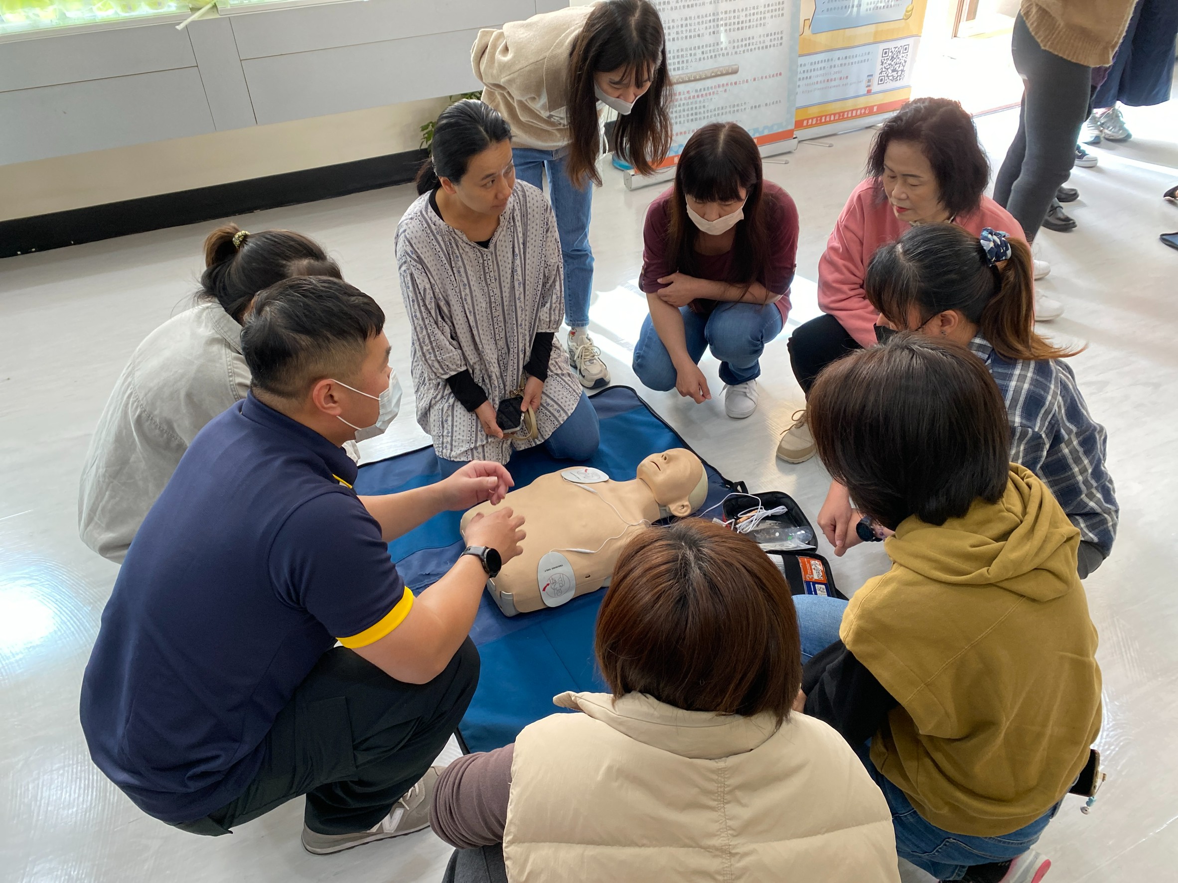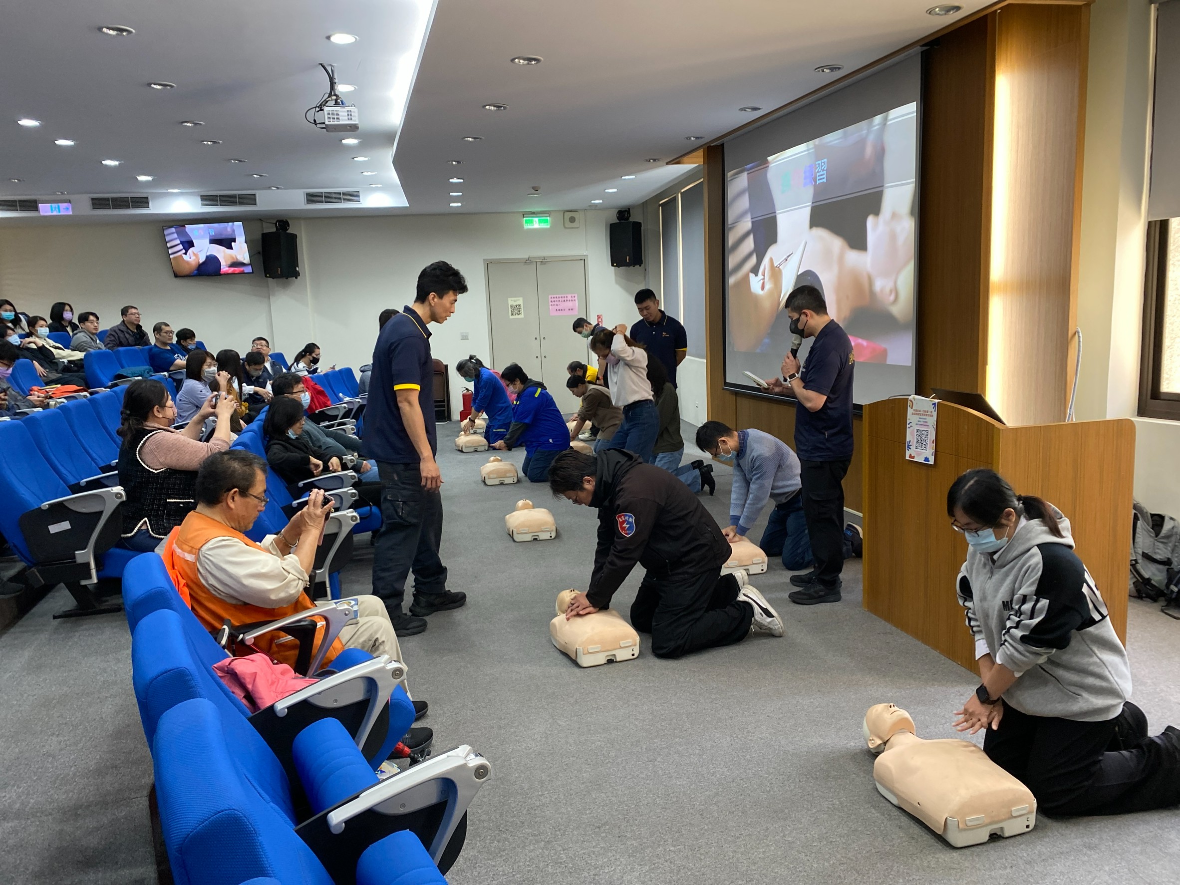 本次課程由消防局第一大隊龜山分隊廖建權教官講授CPR與AED之操作重點,以「實作」、「演練」、「情境模擬」為核心,透過心肺復甦術(CPR)操作步驟、AED設備判讀與使用技巧、急救正確觀念釐清、常見職場緊急事件應變流程,以及實務案例分享等,帶領學員實作強化胸外按壓技巧及AED正確使用時機。