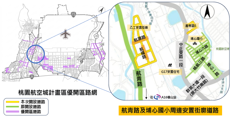 為兼顧通行需求,市府將陸續開放優開區安置街廓及安置住宅內道路,於4月2日正式開放A18安置住宅周邊水源南路等19條、機捷A16橫山站周邊航源路等7條,以及埔心國小周邊道路2條。各路段開放前均已完成五大管線地下化,並落實道路鋪面、照明與排水系統等工程。
