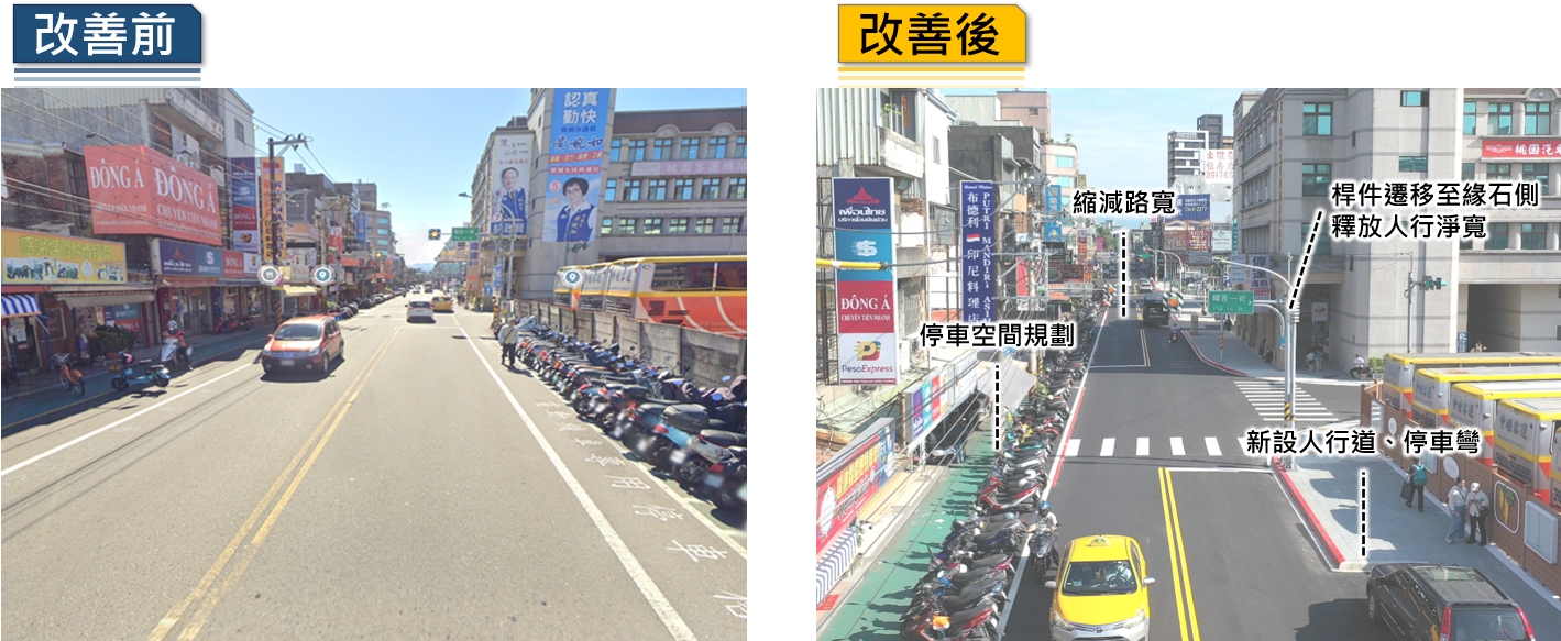 另外都市發展局「民權路X成功路藝文生活通學步道」成功連結桃園區中正路、中山路與騰空路廊,整合新舊城區,透過人行道實體化與家長接送區規劃,大幅提升學童通行安全。此外,更將徒步空間提升為帶狀廣場,開闊整體視覺及景觀空間,並於步道沿線增設座椅,提供民眾舒適的散步休憩空間;住宅發展處「桃園市景福宮周邊道路及人行道改善工程」則結合舊城再生計畫及特色老屋立面改造,透過路口人行道外推、完善路緣斜坡,並設置車阻與行人專用時相,建構全齡化無障礙、安全暢行的人行環境,不僅優化都市景觀,更有效復甦都市機能。此外,中壢區公所「桃園市中壢區中大路道路及人行環境改善工程」藉由道路空間重整,縮減車道寬度並規劃合理停車位,將空間重新分配予行人與綠帶,並帶入道路工程全生命週期的養護整建思維;蘆竹區公所的「蘆竹區錦興國小周邊通學步道改善工程」優化校園周邊設施,改善轉角停等區等空間配置,設置連續綠帶,塑造整體安全舒適的通學廊道。