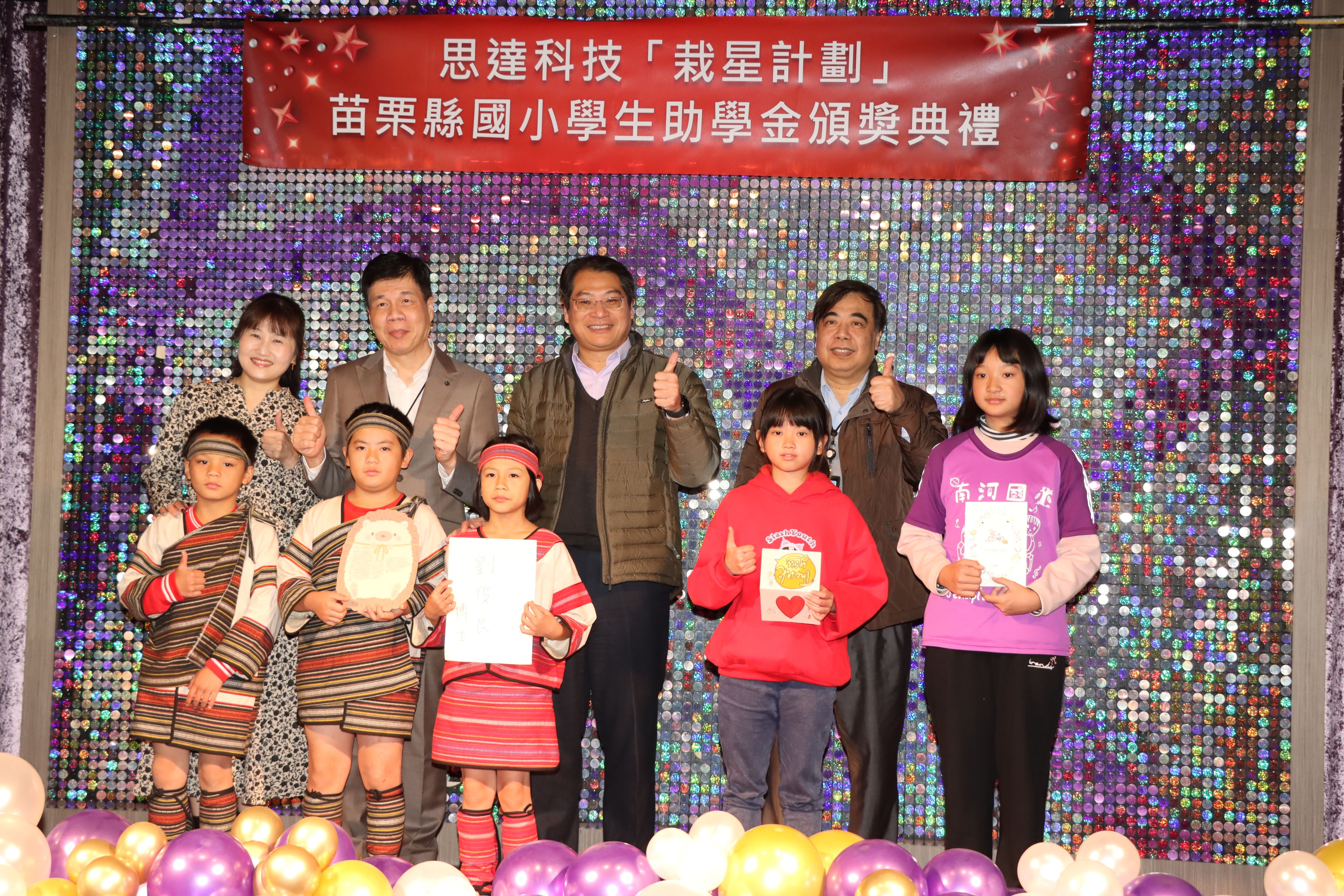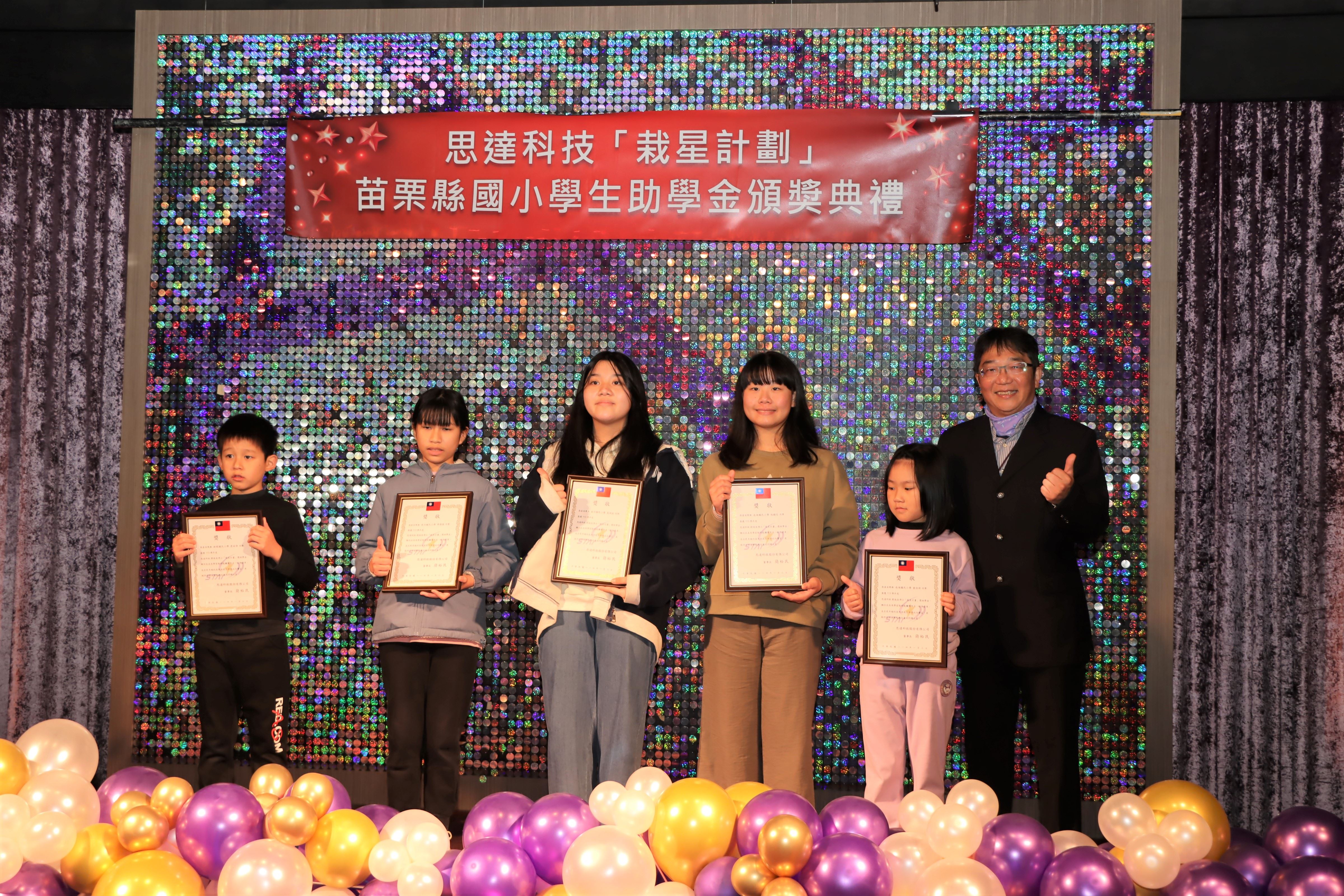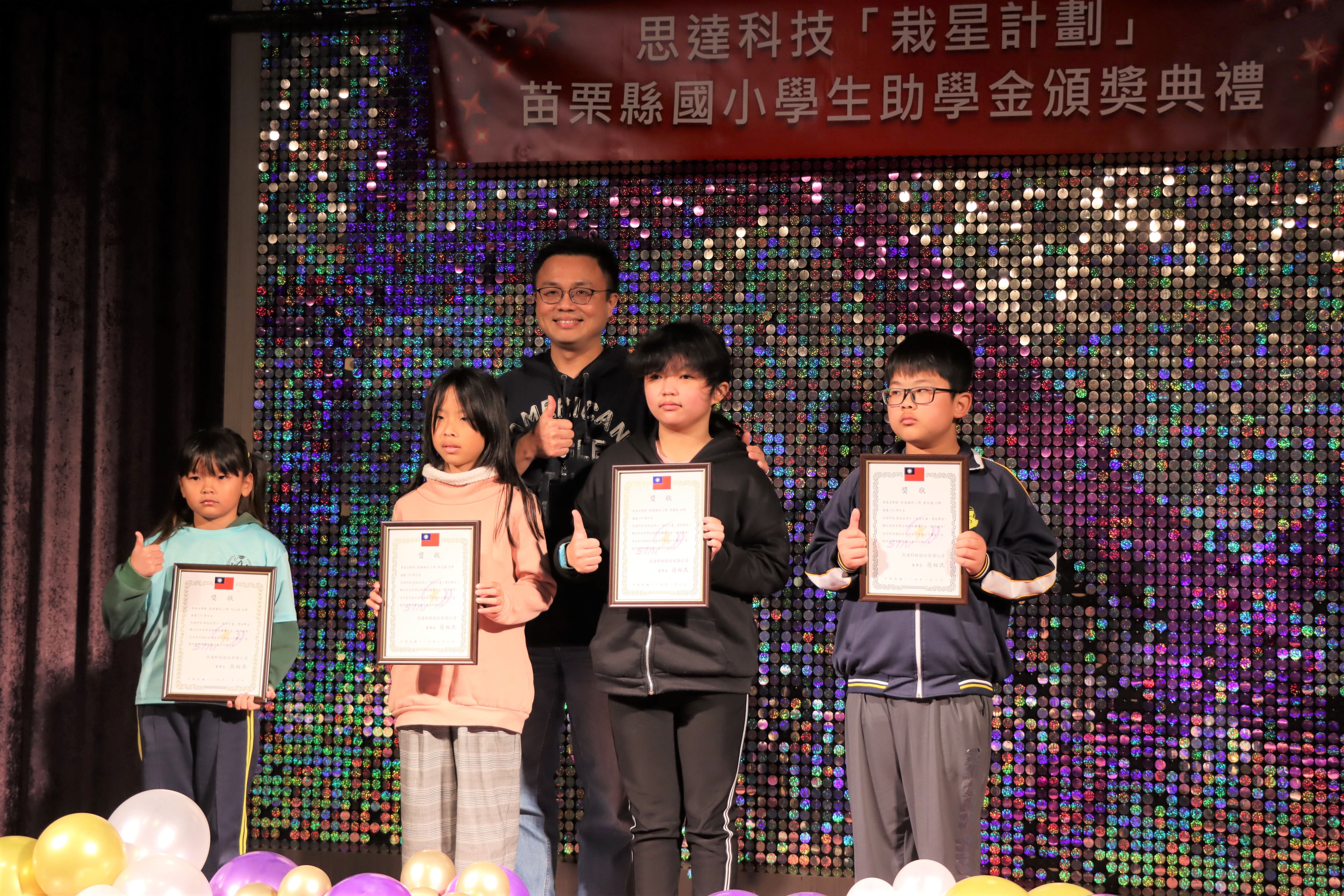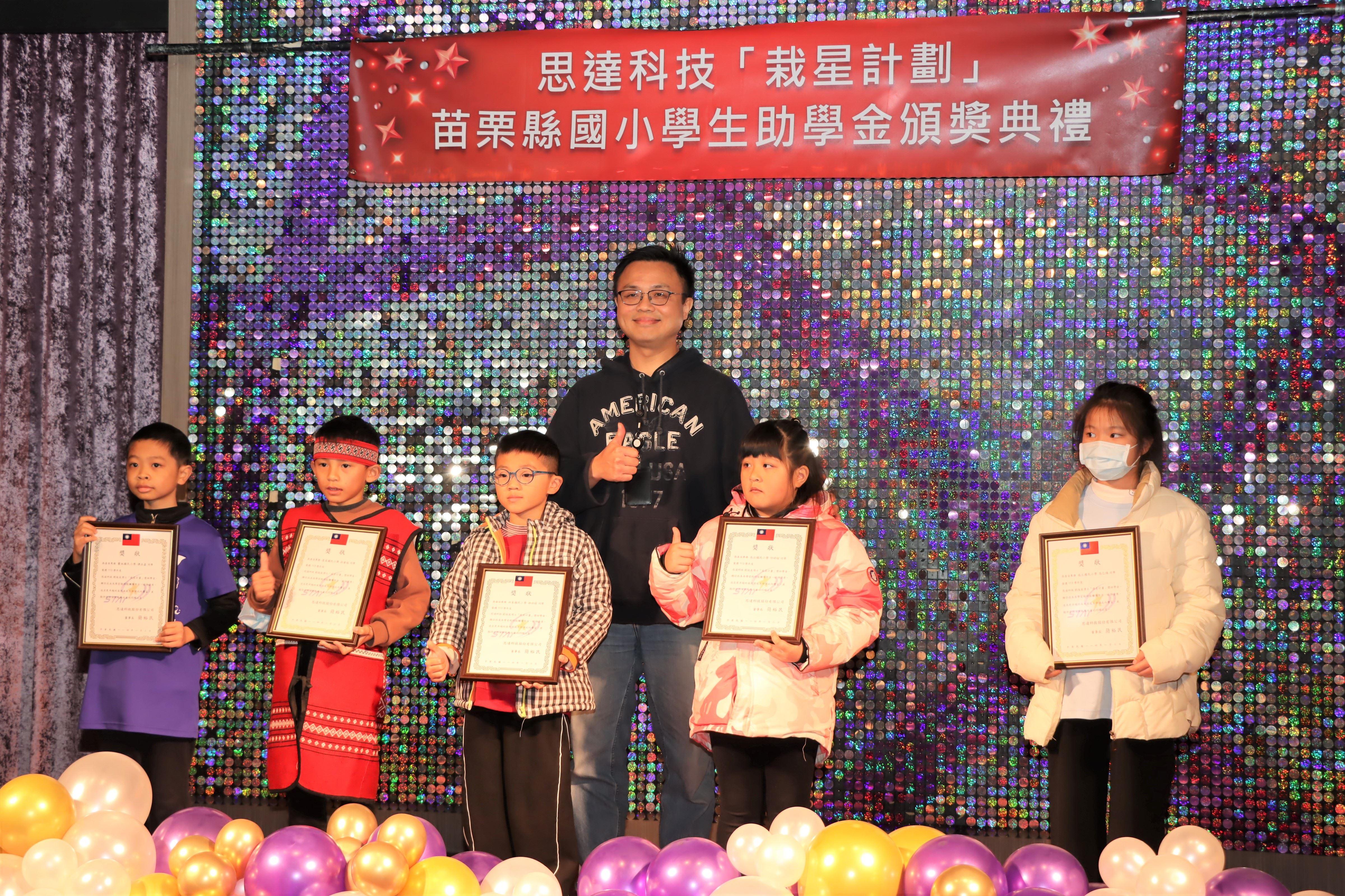 113學年度思達科技「栽星計畫」苗縣國小學生助學金頒獎典禮,1月3日上午在頭份市君樂飯店4樓夏愉廳舉行,捐贈獎助學金的執行長劉俊良博士且與受獎學童面對面互動對談,鼓勵學子們保持學習的熱忱,縣長鍾東錦期勉秉持「今日人幫我,明日我助人」的感恩心念,持續努力,勇於追夢。