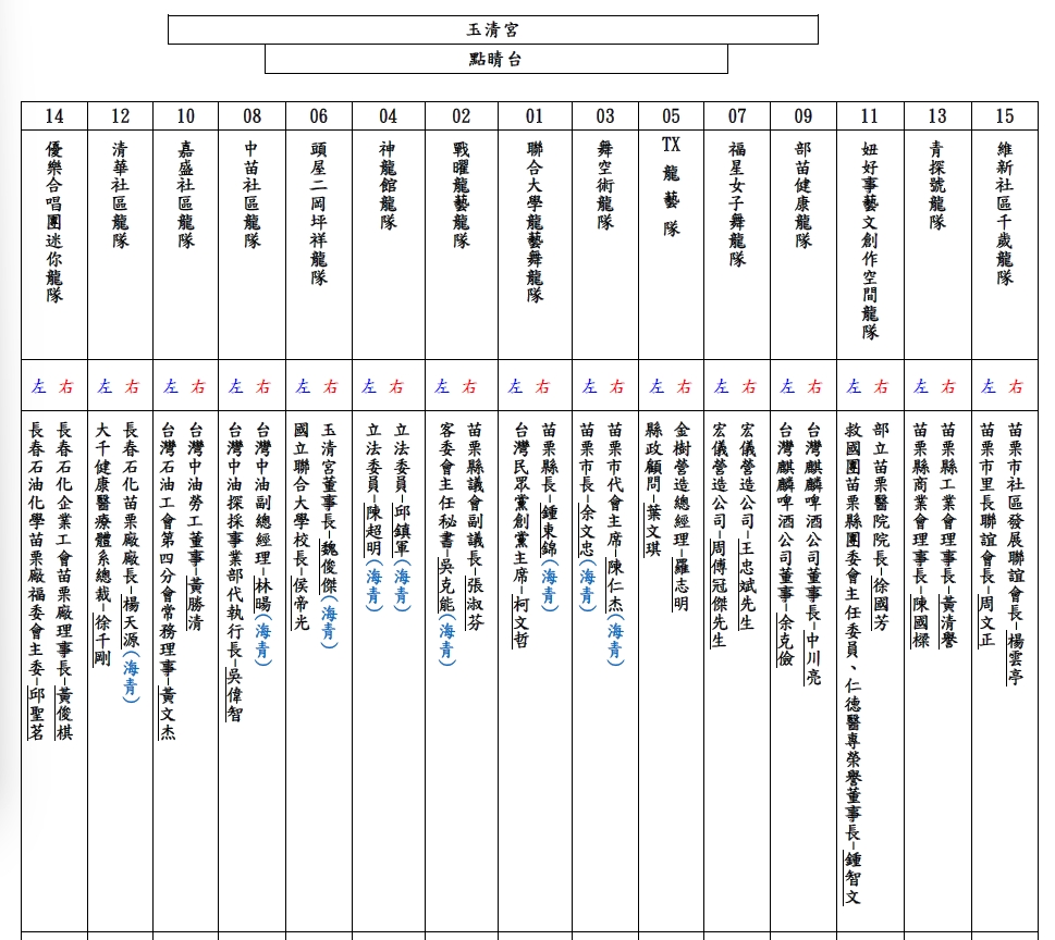 點睛儀式循古禮進行,由余文忠市長率眾向玉清宮眾神上奏表章,隨後由科儀老師依傳統「取紅」儀式,將米酒、硃砂與白鳳血調和,依序為祥龍點睛開光,自龍睛至龍身、龍尾逐一完成,象徵靈氣注入、神威顯赫。儀式完成瞬間,群龍齊舞,搭配煙霧特效宛如騰雲駕霧,震撼全場。隨後十五尾祥龍排列成壯觀祈福龍陣,開放民眾穿越「龍門陣」沾染龍氣,祈求新年「旺來平安」。主辦單位並準備限量「2026苗栗𪹚龍」紀念抱枕致贈民眾,象徵福氣隨行、平安吉祥。