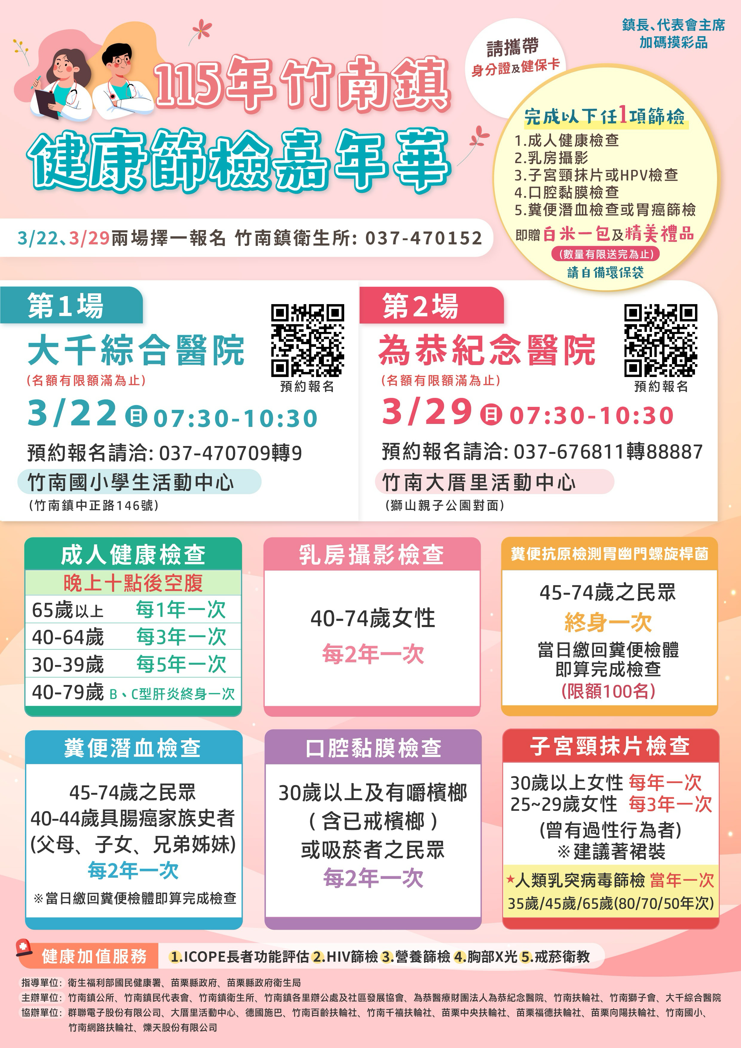 苗栗縣政府衛生局結合竹南鎮公所、竹南鎮民代表會、竹南鎮衛生所與大千綜合醫院及為恭紀念醫院資源結合,辦理「竹南鎮健康篩檢嘉年華」大型整合性篩檢活動。兩場篩檢時間分別為: