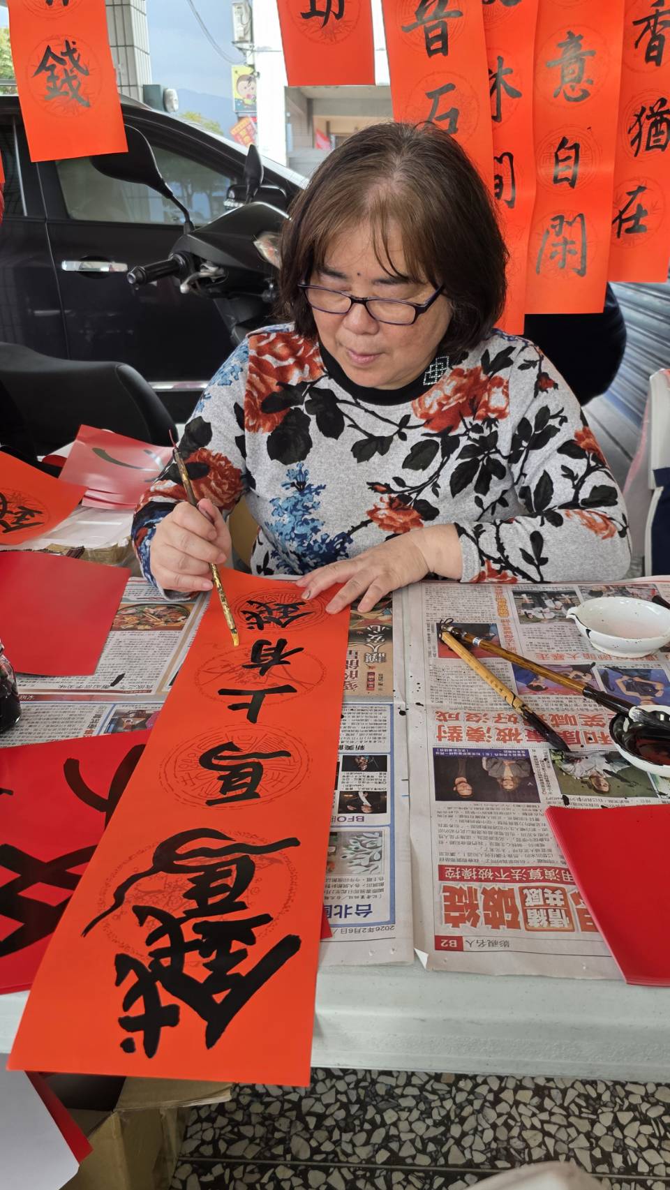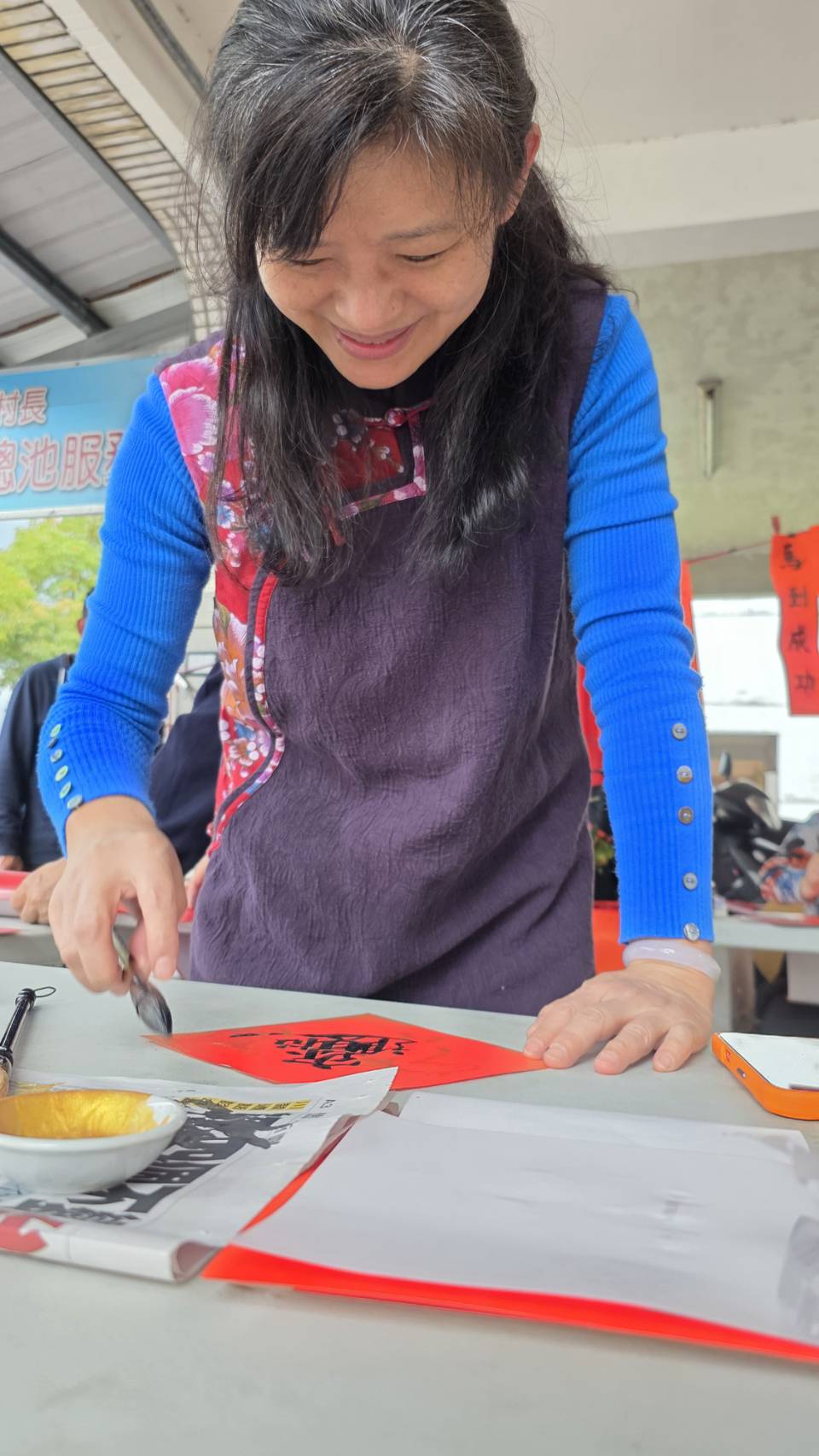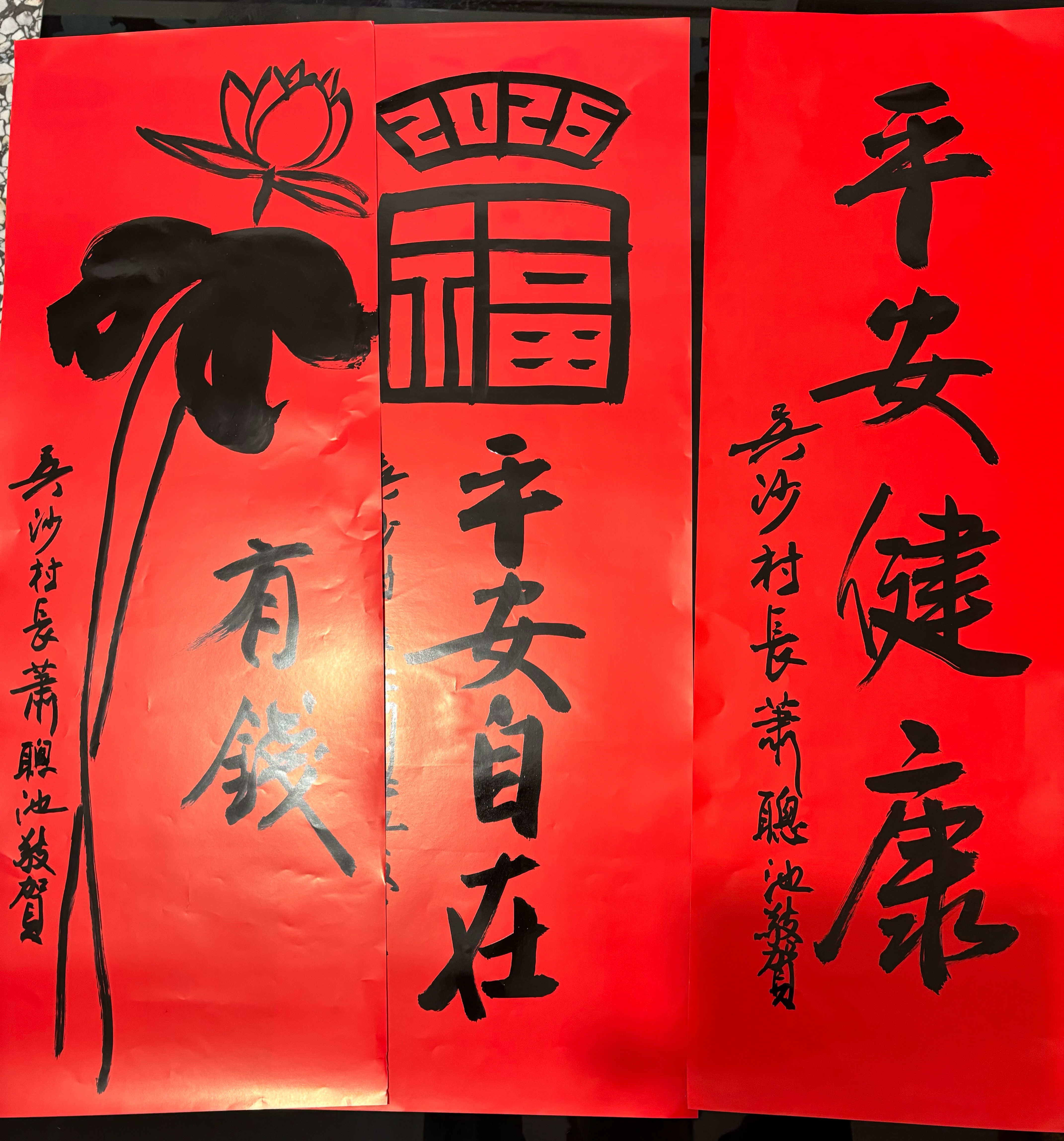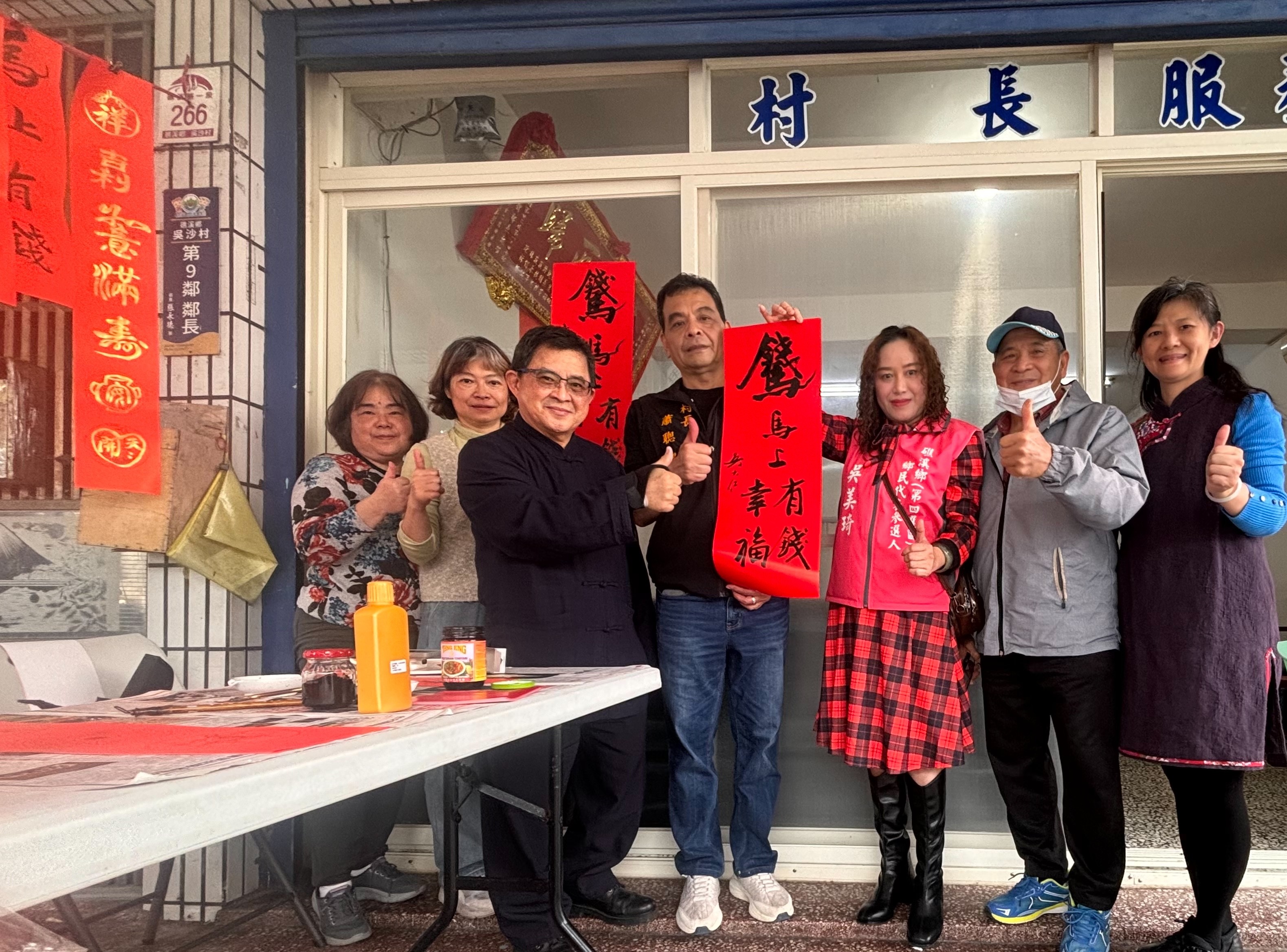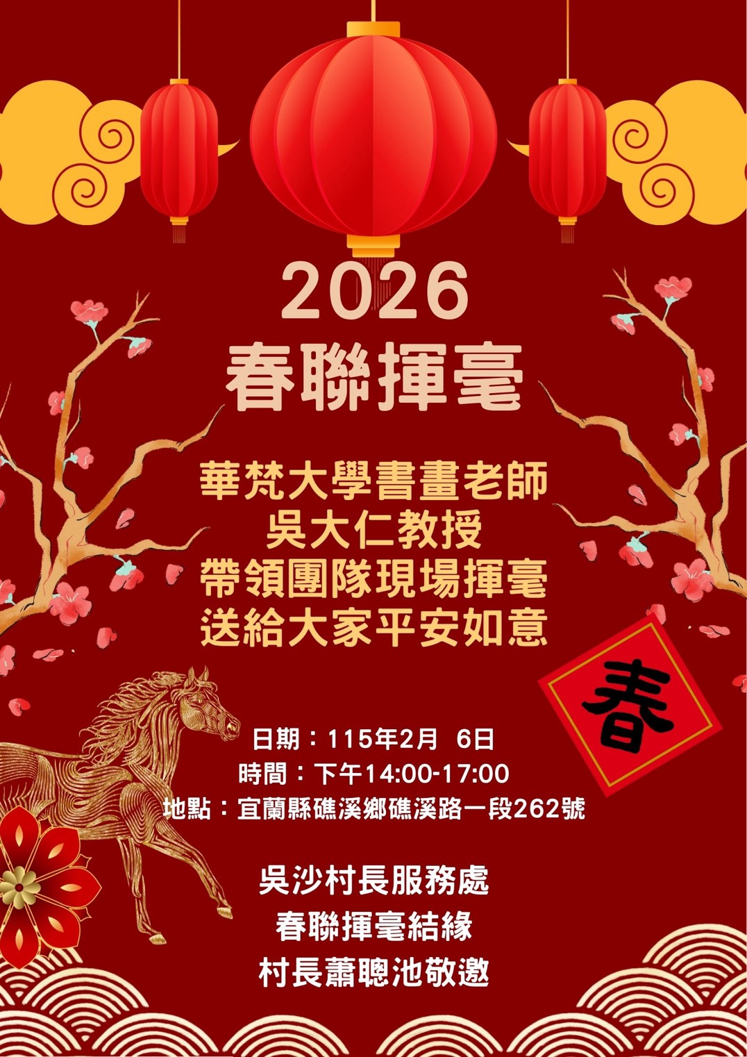 吳大仁高興地說:「宜蘭是我的故鄉,雖然不常住在這裡,但我始終惦念著家鄉的一草一木。前幾天,我才剛結束帶學生赴大陸的交流行程,便馬不停蹄地應吳沙村蕭村長之邀,回鄉與村民們以春聯結緣。看著鄉親們拿到春聯時的笑容,我內心非常感動,能在寒冬歲末,透過書寫春聯與大家交流,讓我感到無比溫暖與喜悅。祝福大家都能過一個平安、祥和、快樂的馬年!」