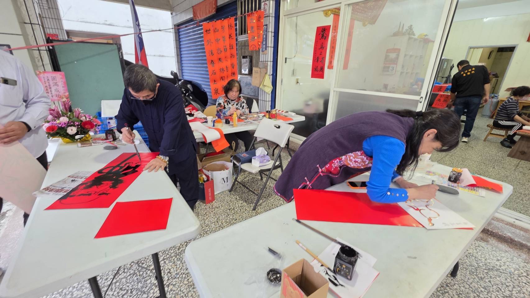 兩岸知名書法篆刻大師吳大仁,昨(7)日下午帶領其書法團隊書法老師涂慧真、劉姿妙、曾韻珊等人,到宜蘭縣礁溪鄉吳沙村村長蕭聰池服務處,揮毫送春聯,鄉親們拿到大師的春聯視若珍寶捧在手樂開懷。