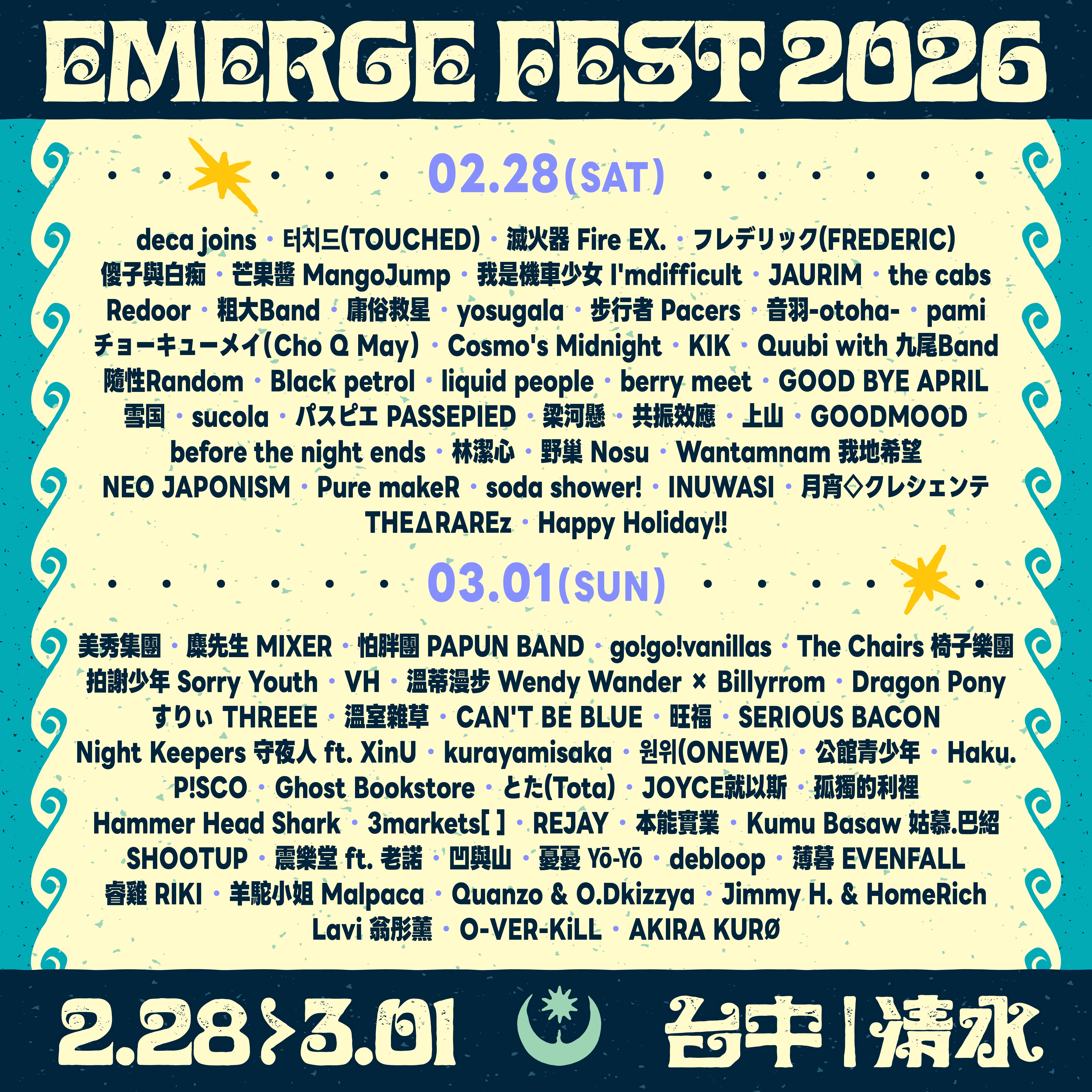 演出陣容包括被日本潮團Nulbarich 主唱JQ發掘的北海道的音樂人REJAY、近期泰國竄紅的可愛新生代歌手pami等。台灣本土代表也有美秀集團、deca joins、麋先生 MIXER、怕胖團 PAPUN BAND、芒果醬 MangoJump 等多組樂團參與,讓二月的台中清水成為冒險精神的重要文化座標!