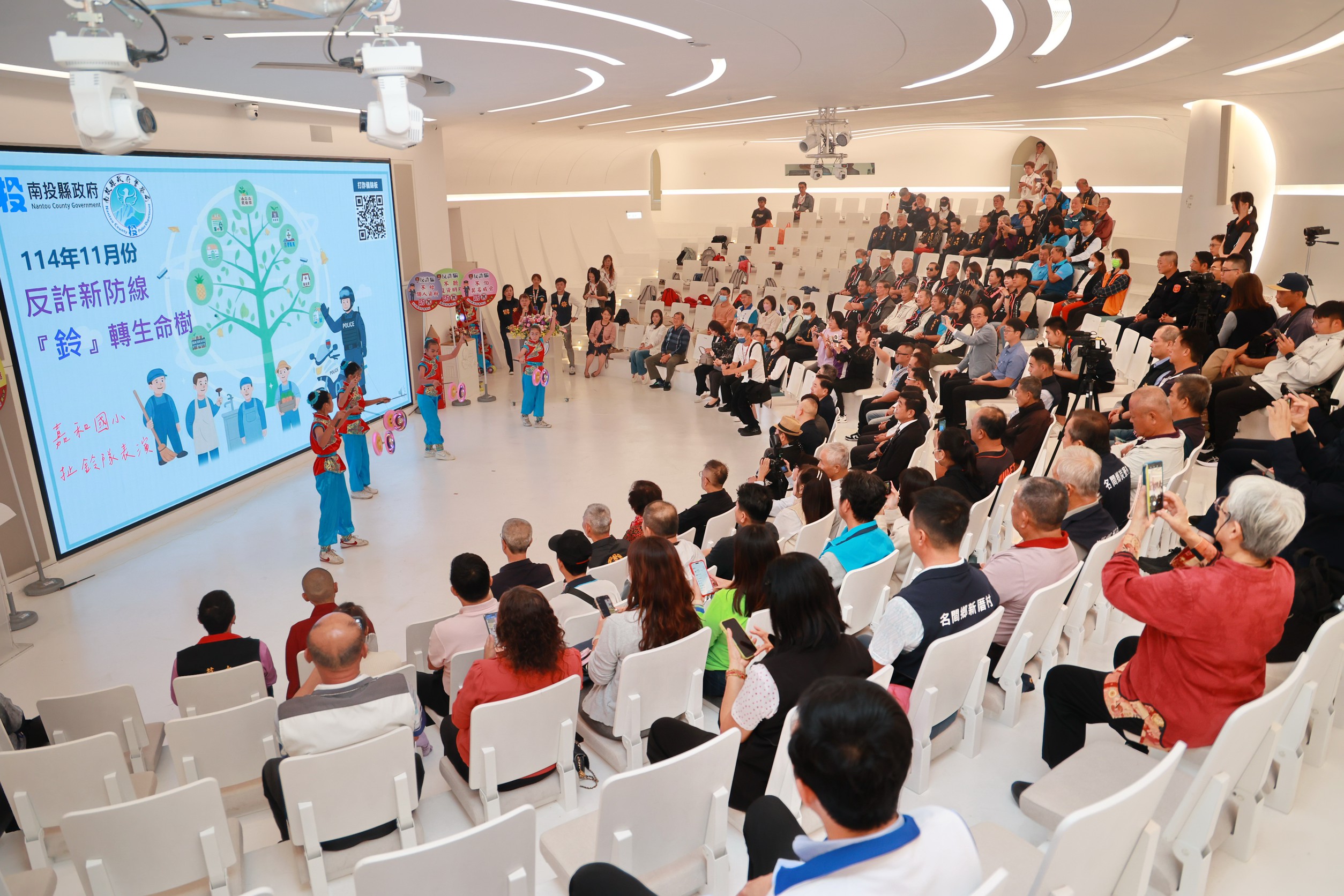 縣警局打詐記者會,邀請南投市嘉和國小表演花式扯鈴,也讓學生了解打詐的重要,知名藝人黑面出任南投縣反詐騙宣導大使,他用幽默的口吻,宣導民眾注意,不要被騙。