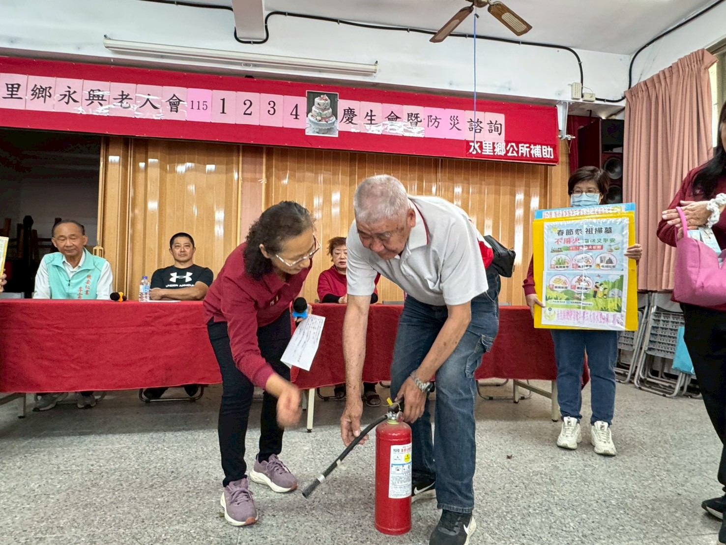 水里鄉永興老人會於3月27日上午10時在水里鄉永興村活動中心辦理慶生會活動,並結合水里消防分隊及水里防火宣導隊於現場協助辦理『居家消防及防火安全宣導活動』。