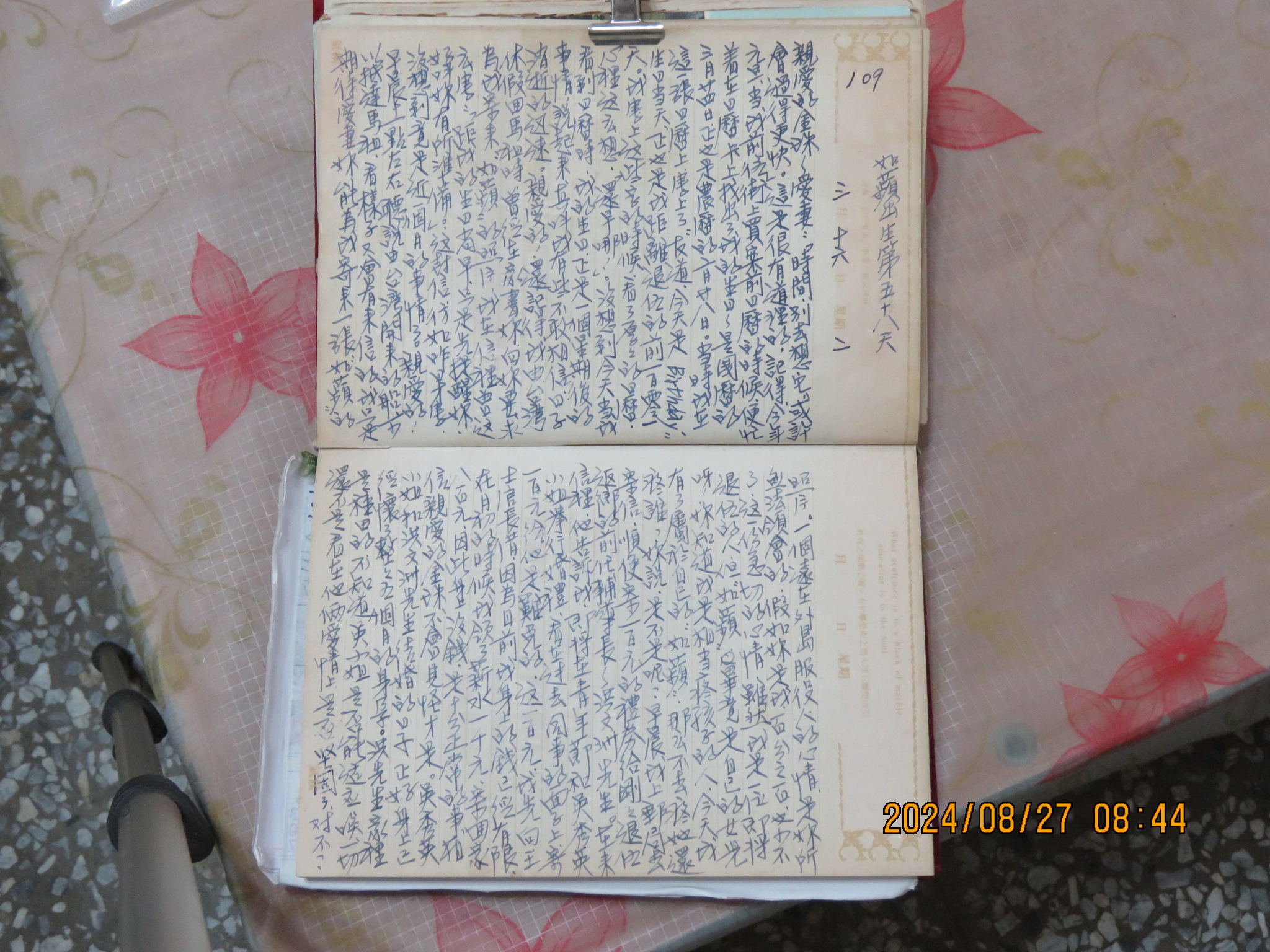 這是56年前的日記,時間過得好快喔!大女兒張如蘋,今年虛歲57,日記裡有張如蘋出生第1天【60(1971)年01月18日】、張如蘋出生第2天【60(1971)年01月19日】、張如蘋出生第167天【61(1972)年07月03日,友道退伍、沒船】,......的記載, 在記載中可以讀出,對親愛王金珠太太一份真誠的愛,一份毫無保留、赤裸的愛,……!在記載中,更可以讓我張友道玄德,清楚回憶起55、56年前,這半年多軍中甜蜜生活的片段,......。