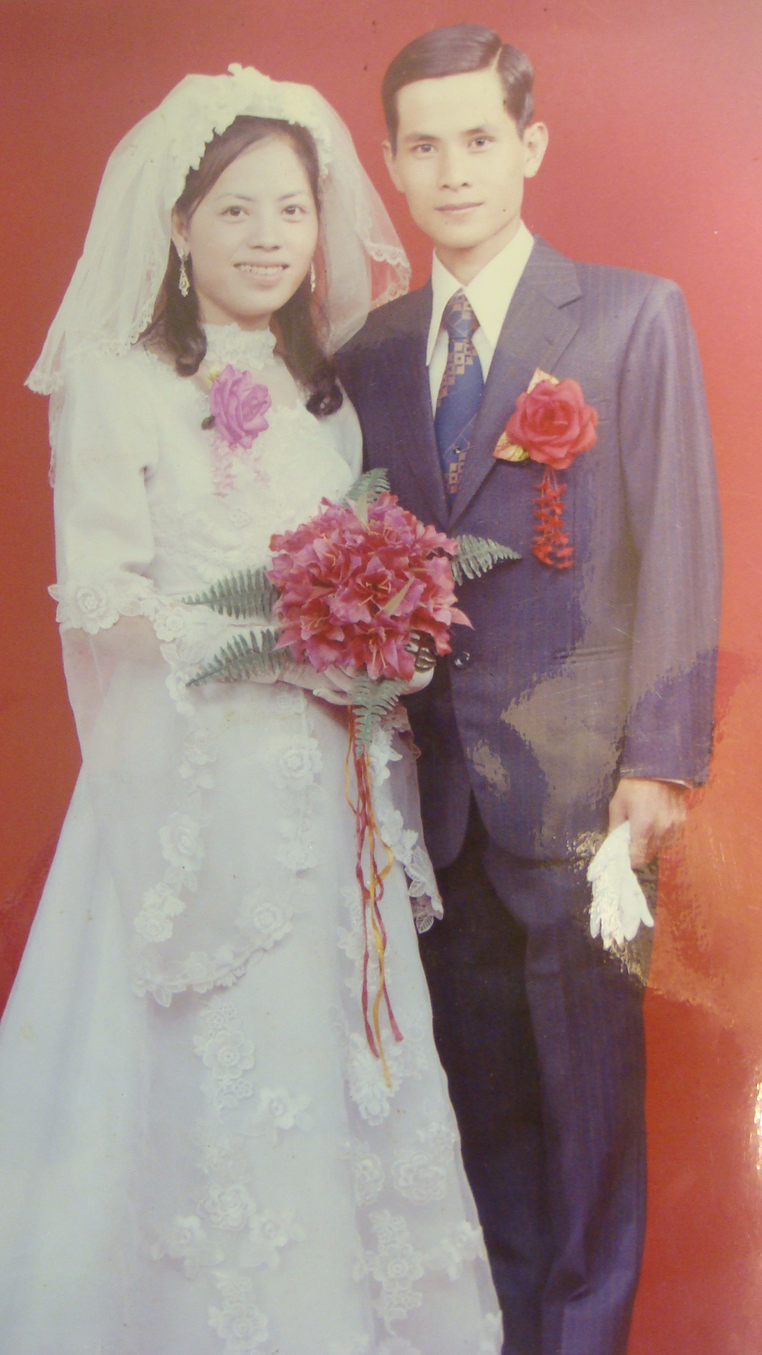 張友道、王金珠的結婚照。 (複製) 。這張照片是我退伍後結婚5週年補拍的,因為結婚當年,埔里鎮還沒有彩色照相。