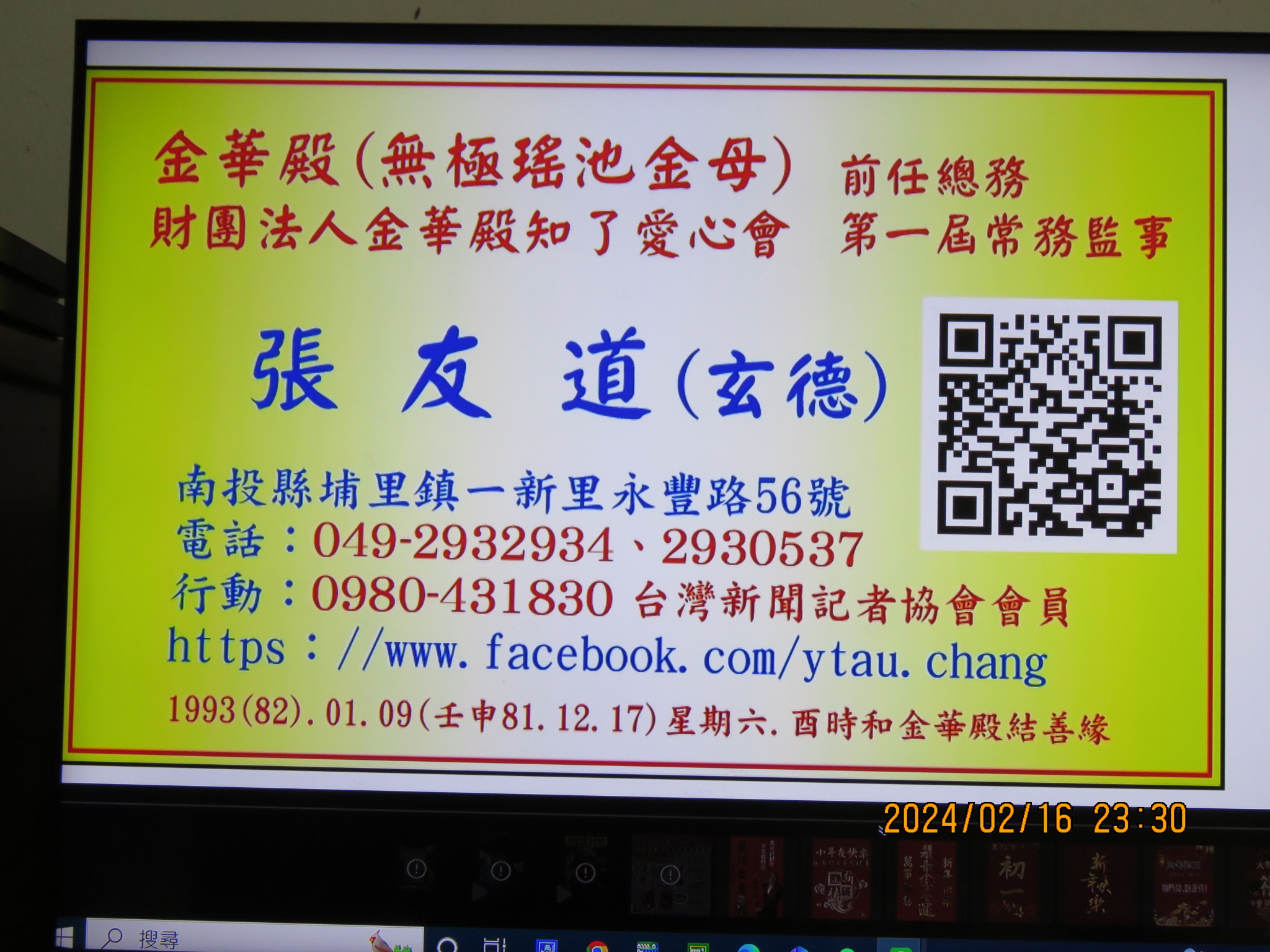 【2024(113).02.16.(甲辰.01.07.)星期五10:37,埔里文慈電腦打字排版社領取. 新印製的金華殿名片~正面。】