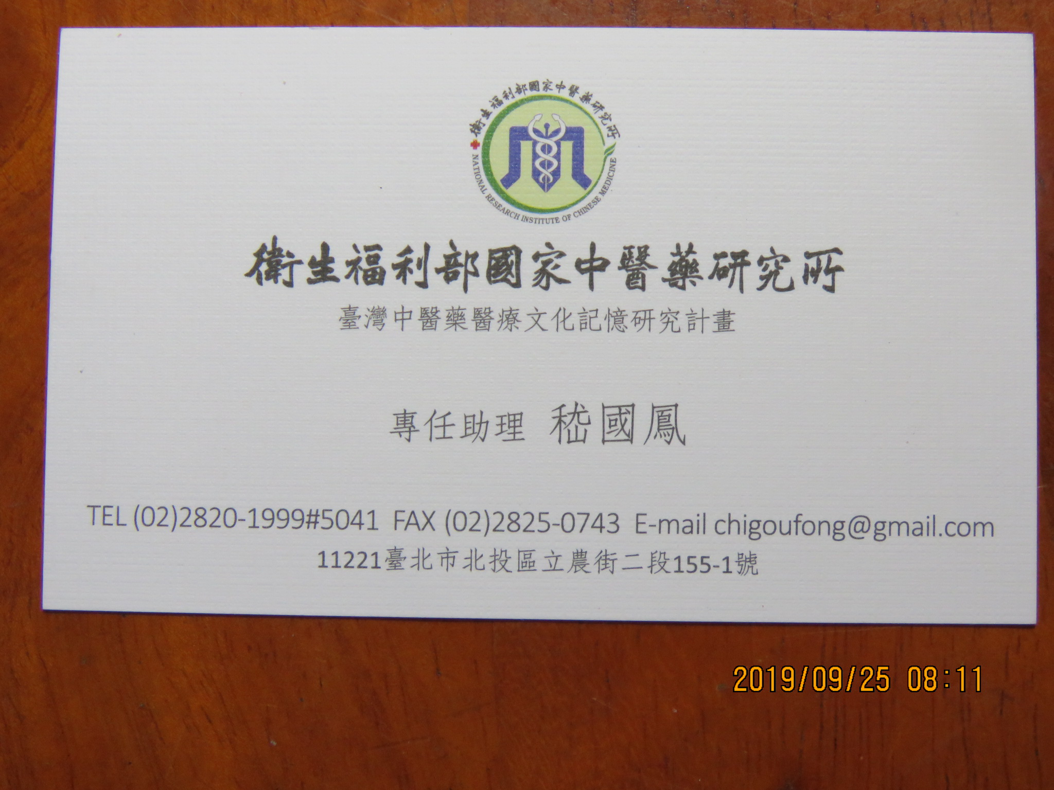 行政院衛生福利部、國家中醫藥研究所,專任助理王士銘、嵇國鳳﹙見名片照片﹚,受行政院文化部~台灣中醫藥醫療文化記憶研究計劃﹙2019~2020﹚之委託,於2019﹙108﹚.09.24.﹙己亥.08.26.﹚星期二13:54~16:00,專程由台北市前來南投縣埔里鎮麒麟里武界路9之12號,專訪祖傳八代老中藥舖已退休經營者~張友道﹙玄德﹚、王金珠﹙妙圓﹚,臨回前,四人在玄孝院合影留念。