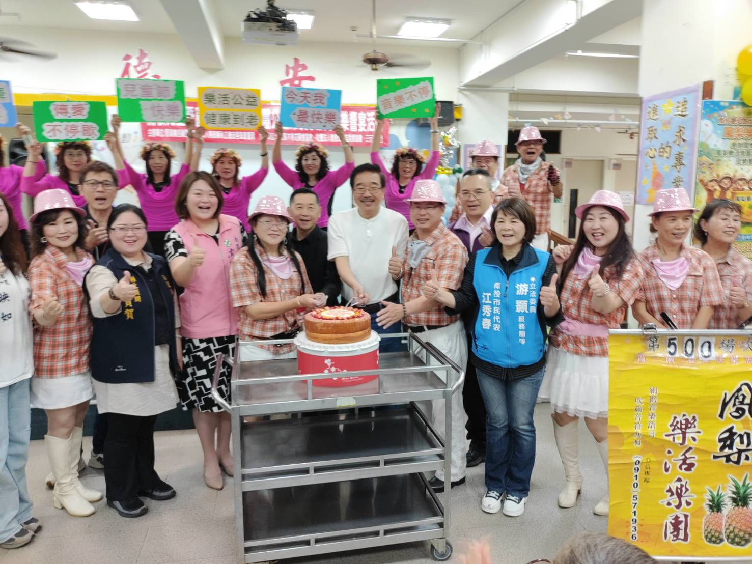 鳳梨樂活樂團長期投入公益演出,服務對象遍及:社區關懷據點、養老院、護理之家 、教養院、育幼院偏鄉與弱勢團體, 截至今天活動樂團已累積500場次的的公益義演,足跡遍及全台各地。今天由團長許美麗親自主持為鳳梨樂活樂團500場次的慶祝活動切下蛋糕。