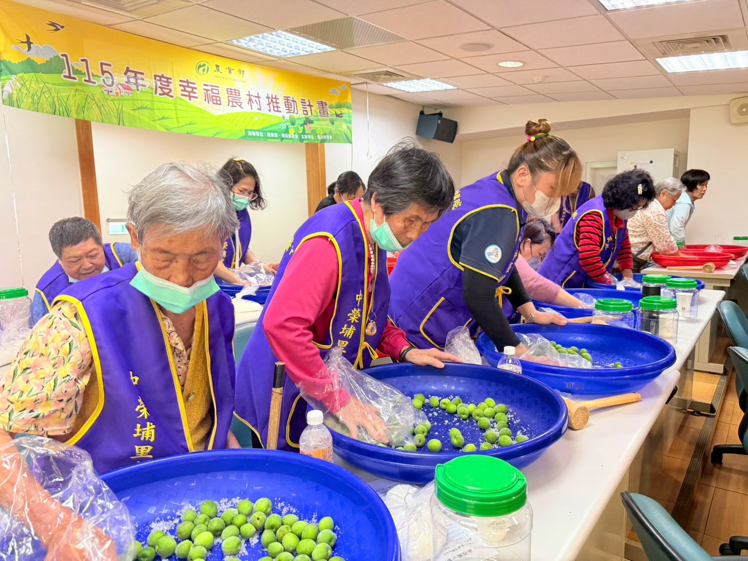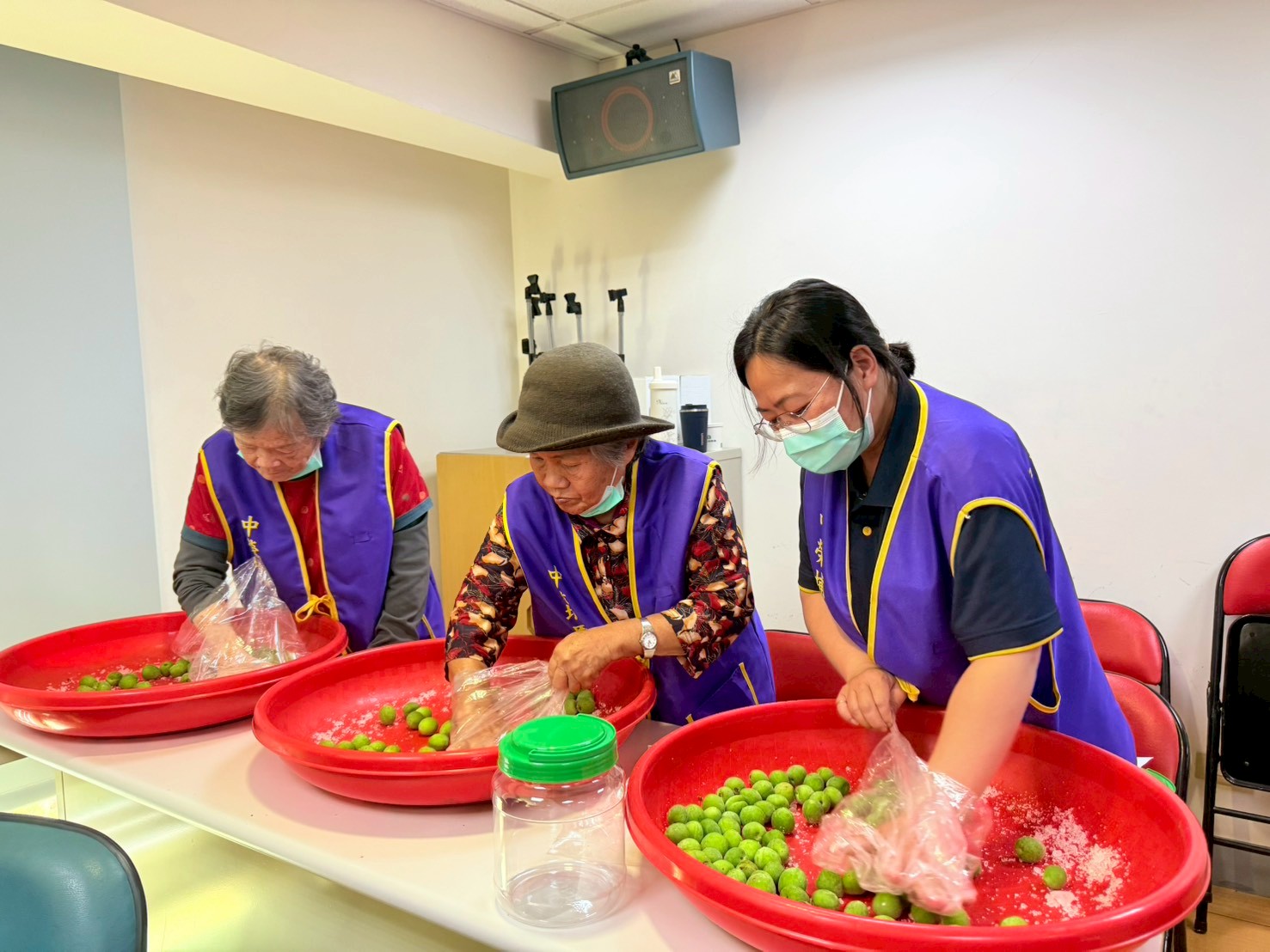 除了戶外參訪,魚光日照中心亦安排了極具感官刺激的「手作青梅」活動。正值青梅產季,長輩在工作人員的協助下,捲起袖子、圍在紅色大盆前,親手揉搓一顆顆飽滿的綠色青梅。這類活動不僅能訓練長輩的手部精細動作與手眼協調,更透過與同儕的互動交流,減緩孤獨感。看著自己親手醃漬的青梅裝入瓶中,長輩們臉上露出了滿滿的成就感。