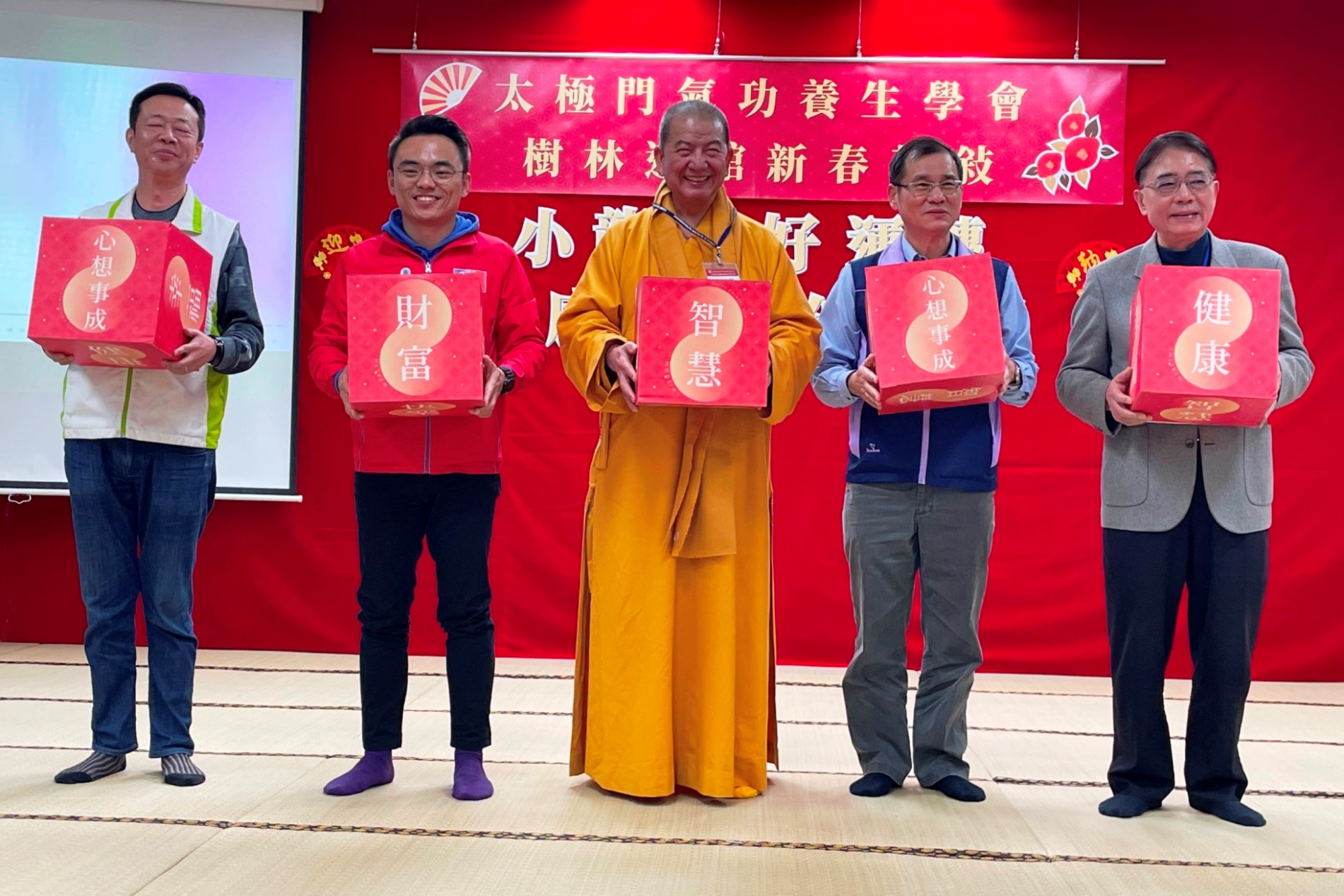 活動播放《太極神龍代相傳》影片,傳遞慈悲、勇敢、真智慧,護佑人間太平、家家平安。現場在祥獅引路下,天官送福袋,祈願大家有福氣、有勇氣,歡喜渡過2025年;還有銀髮族師兄姊帶來《四季紅》阿哥哥組曲。《2024師徒同心 全球傳愛》的影帶中,看到太極門師徒2024年到世界各地傳遞愛與和平的行腳足跡。焦點儀式中首先靜心祈福一分鐘,希望散播正向能量,期許新的一年可以平安順利。貴賓們手握6面寫滿吉祥與祝福話的骰子,骰出對自己也對大家祝福的一句話。