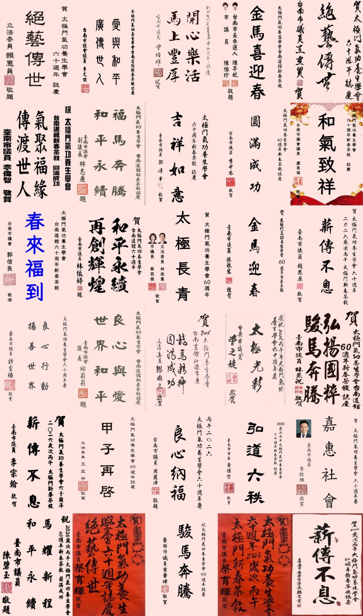 各界貴賓紛紛致贈墨寶,不僅祝賀太極門氣功養生學會成立 60 週年,更表達對其長期貢獻社會和平、傳遞安定力量的深切肯定。