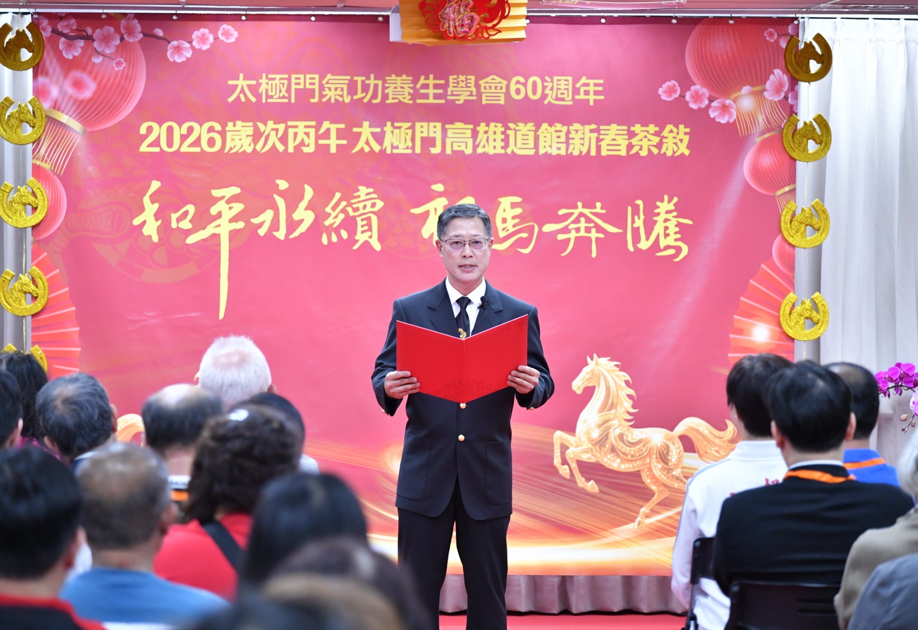 【記者洪祐民/高雄報導】3月8日太極門高雄道館舉辦「2026歲次丙午新春茶敍」,以「和平永續 福馬奔騰」為主題,各界貴賓齊聚一堂,共同見證太極門氣功養生學會成立60週年,一甲子榮耀輝煌的里程碑,並彼此恭賀馬年新春吉祥。立法院顧問黃昭順、立法委員許智傑、高雄巿議會前副議長黃石龍、三民區公所區長陳昱如等與會嘉賓以龍馬精神互勉,期盼在新的一年攜手為社會注入更多良善力量,讓健康與和平的種子在社會各角落持續發芽、茁壯。