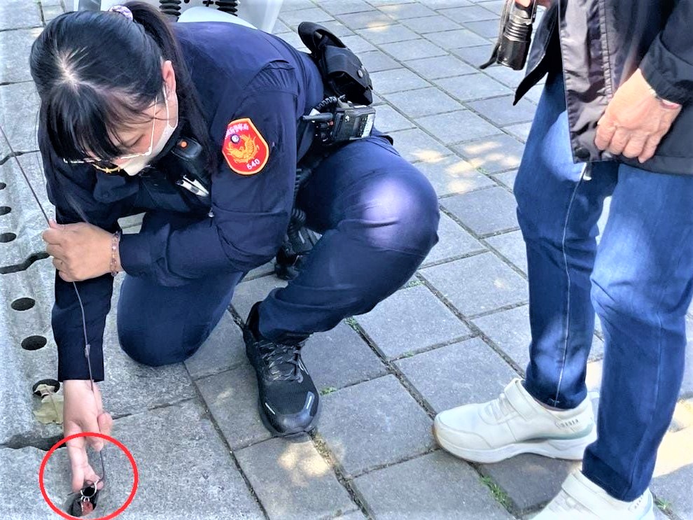 老婦人聽後雖有些不好意思,但在無計可施的情況下,只好懷著忐忑的心情撥打報案電話,希望能獲得協助,員警獲報案,查看所內工具,發現一段鐵絲,便靈機一動,現場將鐵絲彎折成小勾狀,再耐心地從排水溝縫隙慢慢伸入,經過多次嘗試與調整角度,終於順利將鑰匙勾起,當鑰匙被成功取出時,老婦人當場露出如釋重負的笑容,不斷向員警表達感謝之意,直說若沒有警方協助,自己真不知道該怎麼辦。