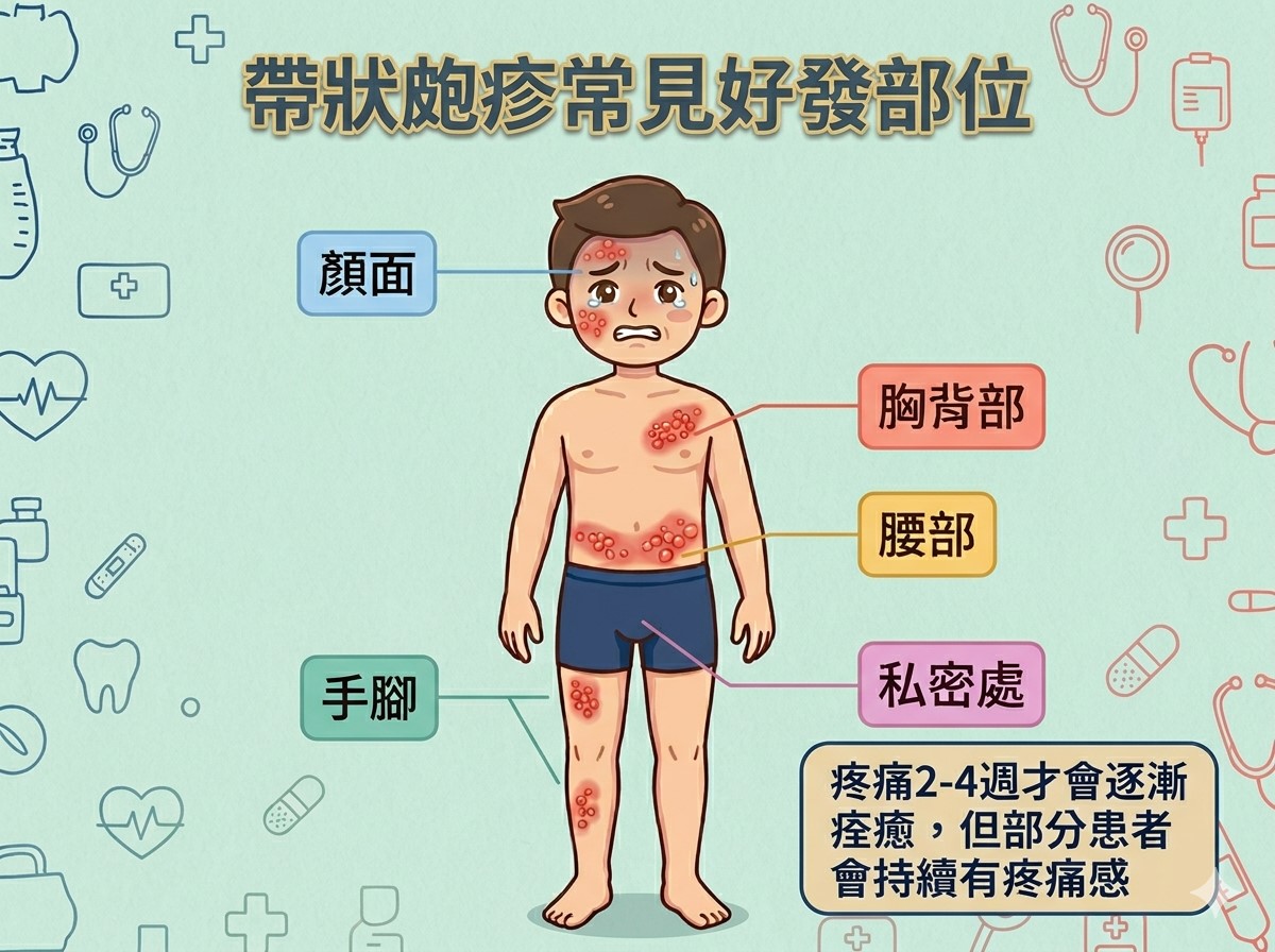 廖忠信主任指出,造成帶狀皰疹的病原是水痘帶狀皰疹病毒,它的成因是患者過去曾感染過水痘,即便痊癒後,該病毒並未完全消失,而是潛伏在神經節內,當人體免疫力下降時,病毒就會再次活化,以帶狀皰疹的形式呈現;帶狀皰疹的分佈非常廣,可能出現在顏面、胸腹部、會陰部、手腳,通常在經過二至四週的疼痛煎熬後,皮膚紅疹水泡才會逐漸痊癒改善,但仍有一部分病患會留下持續的疼痛感,稱為「帶狀皰疹後神經痛」,痛起來時間長短不一,大大影響生活品質。