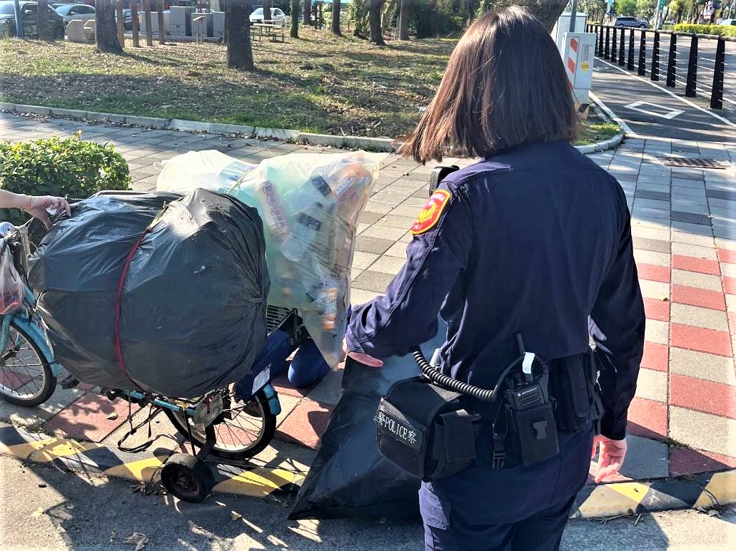 員警發現老婦腳踏車上載了許多資源回收袋,且其中一袋回收物掉落於道路上,員警立即將巡邏車開至與老婦身旁並行,以安全為由示意請老婦先停於路旁,以巡邏車停於後方警示用路人;經關懷詢問得知,該身形瘦小年逾80歲老婦,以撿拾回收物維生,員警告知老婦腳踏車上所綁的資源回收袋子繩索已經鬆掉了,已經有一袋回收袋掉落在道路上。