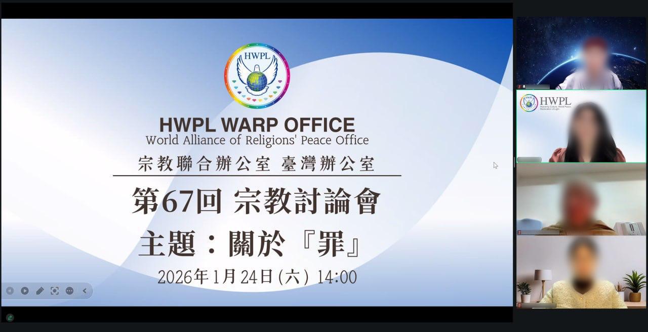 HWPL 臺灣支部宗教聯合辦公室於 1 月 24 日舉行第 67 回經書比較座談會,邀請伊斯蘭教、佛教與基督教代表透過線上方式參與,透過宗教間的對話,共同探討「罪」的本質與其解決之道。